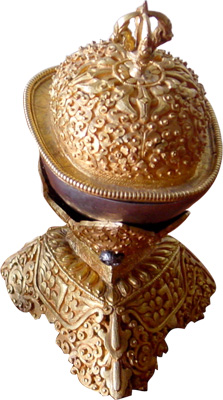 本寺珍藏的噶巴拉,內裡畫有本尊聖像,如上樂金剛、瑪哈噶拉、瑪哈噶哩…等等,外部或刻鏤八吉祥等圖樣,邊緣以銀質骷髏紋樣鑲飾,另配有鎏金材質的上蓋和底座,雕工繁複精美,彰顯了法之神聖、與重法精神之嚴謹。