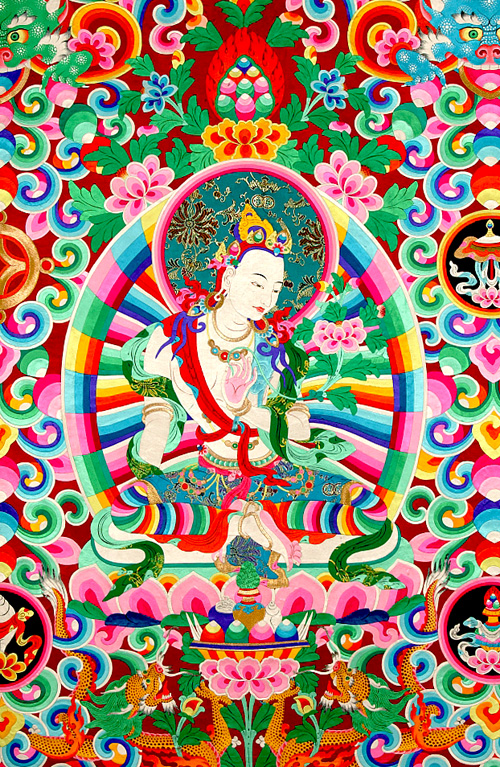《法華經‧普門品》,觀音菩薩以各種善巧方便利益眾生,「應以何身得度者,即現何身而度化之」,除了三十二種應化身之外,在密續中,觀音又化現為四臂紅觀音、四臂白觀音、千手千眼觀音,甚至示現憤怒相,化為馬頭明王、大護法瑪哈噶拉。另外,白度母、綠度母則是觀音悲憫眾生之苦,由眼淚所化現的女性本尊。