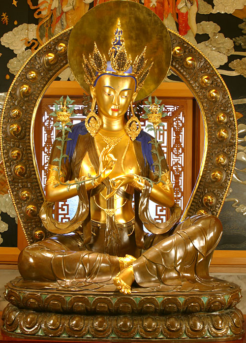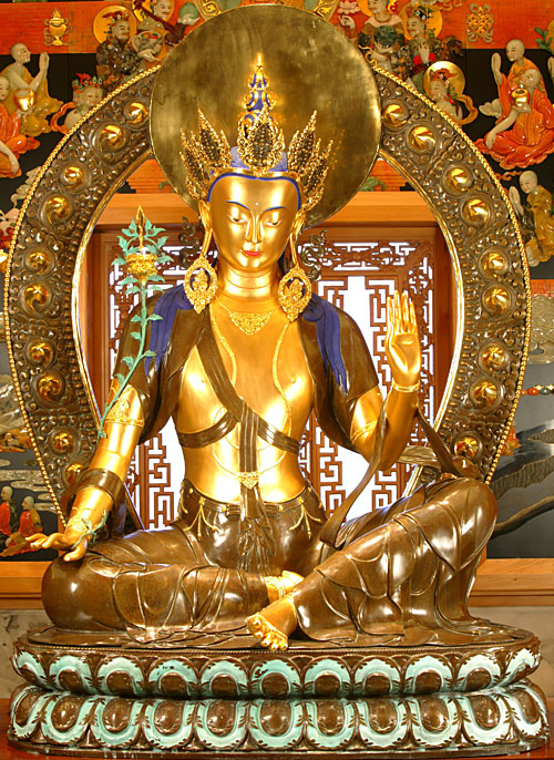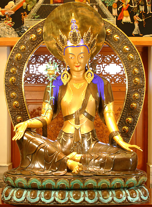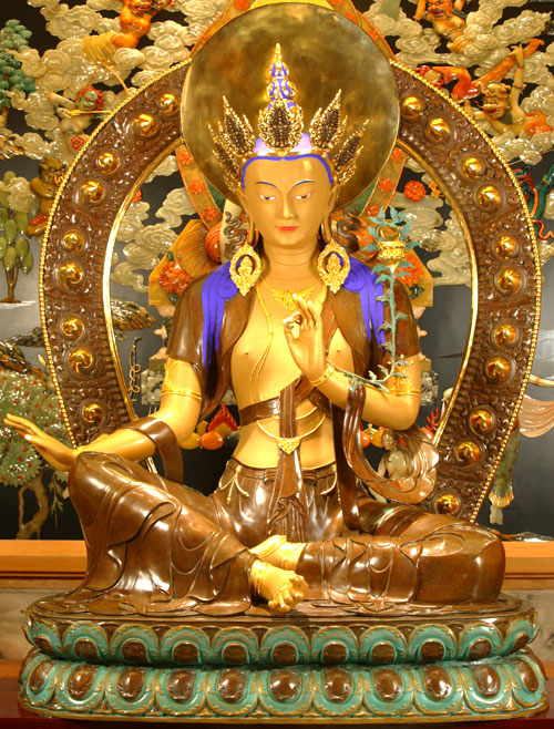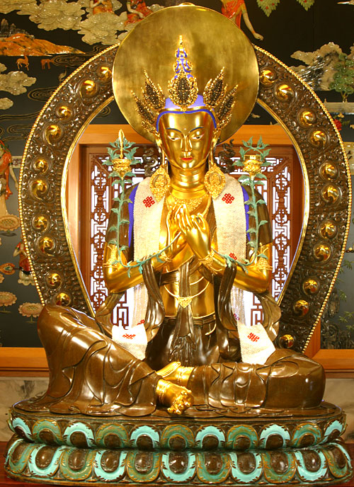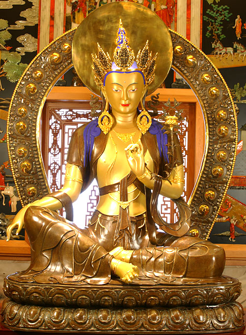 八大菩薩頂戴五方佛寶冠,髮髻最上牟尼寶莊嚴,又佩戴耳環、項鍊、胸飾、腰帶、手鐲、臂釧、足環等八款配飾。另,穿戴冠巾、天衣帔帛、飄帶、長法裙、短法裙等五款衣飾,保留銅鑄原色,古樸沈穩。如是,具足十三種報身菩薩之莊嚴。背光月輪箔金,復以牟尼寶為嚴飾,閃耀輝煌。尊貴無有更上,令人望之心生清淨。 絲綢裙裳薄而貼體,上身裸露,開放的胸襟氣度、高貴典雅,圓滿六度波羅蜜,不執一切相,故裸露;在和平意境中,表現出動人的智慧。天衣飄帶,線條宛轉流暢,彷彿一曲盪氣迴腸的詠歎調,繞樑三日,令人薰然沈醉,忘卻煩惱;又像一帖行書,墨韻飛捲,任他行雲流水!金銅中,箔金古銅梵綠相間,好不生氣;韻意流動,生命的精華,竟也在銅元素中發光發亮,在觀見者心中,孕育菩提大悲。 纖長的手指,優美的弧度,像是枝頭玉蘭花的倩影。自在安坐,好一派閒適雍容。腳趾放鬆舒張自然,如蓮瓣之錯落、又像是一闕音節起伏的樂府詩,訴說著久遠以來的修行故事。沒有正襟危坐的拘謹,卻傳遞了更深層的佛法義諦——心的秘密,無從向緊繃造作中求。 大悲的力量,直透那慈眉善目,令人仰望的霎時,止不住淚光閃爍如波光瀲灩!感動的頂禮,趨前領受加持,菩薩竟然如此貼近,如此真實。 再說一個扣人心弦的故事。 鑄中鑄仁的母親是出家人,晚年癡呆,長期臥病。孩子事親至孝,照顧母親無微不至,省吃儉用擔負龐大的醫藥費,沒有任何積蓄。獲知上師將造八大菩薩聖像,兄弟兩人為報親恩、也為護持三寶,毅然將母親準備留給他們的房子賣了,湊成一筆錢,認供普賢菩薩,以此功德迴向母親。其母往生,上師親自為之開頂指示深奧空性並超薦,瑞相圓滿,往生極樂矣! 世間萬物,最後終歸於塵土。唯有大悲、至情、菩提心,將與天地虛空長存,在凝望聖像的剎那,輕輕喚醒我們的佛性…… 吉祥日午時,仁波切為八大菩薩開光,出資造像者為聖像掀紅、並獻上晶瑩的珍珠卡達。天飄花雨,祈請菩薩降臨安住,開啟眾生本具菩提心,勇猛精進菩薩行。願聞者合十同讚不可思議,偉哉菩提薩埵! | ||||||||