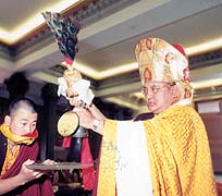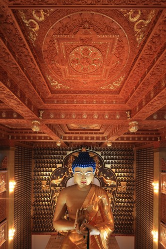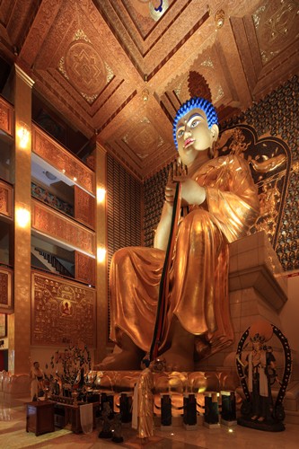 金黃澄澈的巍然釋尊,輝煌無比!創台灣室內大佛之最,巡禮的人,每每在仰望佛容之際,讚歎不已! 與台灣常見的佛陀造像迥異 一尊十六公尺高的釋迦牟尼佛,端坐於金剛寶座,雙足垂下如彌勒坐姿,以蓮花承托。雙手結「說法印」,延續佛陀永在人間說法、佛法常住娑婆!靜默地,台灣歷經二十餘年的藏傳佛教滋潤,喇嘛的弘教,有著見證歷史的噶瑪寺。在這兒,莊嚴的大佛支舉著不可見的歷史文化與傳承,帶給我們靈性的昇華。 對藏密藝術的熱忱 大佛前額毫光,由三百顆鑽石鑲嵌而成。白毫光,這是大佛身上極為細小的一個點,但卻朗耀地,顯示信仰的見證力量。佛陀額間白毫放大光明,普照六道眾生的,不再僅是一件藝術品而已。 佛前兩側銅像為舍利弗、目犍連二大弟子,與傳統的阿難、迦葉有別,更顯年輕;這純粹是想引導希望的信息,而它來自朝氣的身心。值得一提的是,舍利弗、目犍連二大弟子尊像,以三折姿而立,纖柔細膩、線條優雅,又極具動態之美,洋溢著豐沛的生命力。 上師神通無處不在 佛像安裝完成時,承包商恭請仁波切親往檢視是否居中。仁波切站在大門往內一比,笑著說道:「差一吋!」包商問:「往左或往右?」仁波切不假思索回答:「往左移一吋。」後經重測,果然如是。包商立刻當天加工,修正一吋,而成如今模樣。事後,有人向 仁波切請益:「可有方位風水?」仁波切說:「四正即是好位。」真是笑談間神通無處不顯! 如佛降誕的開光大典