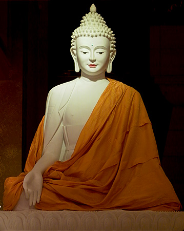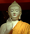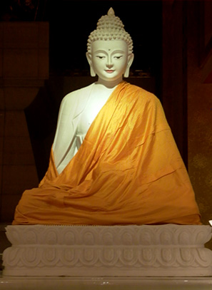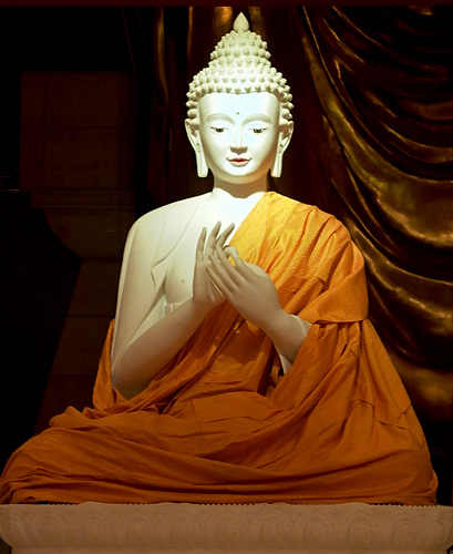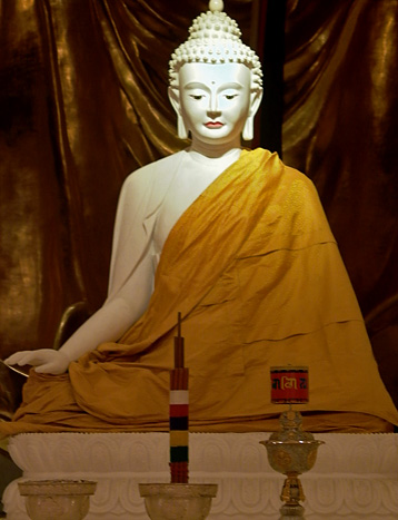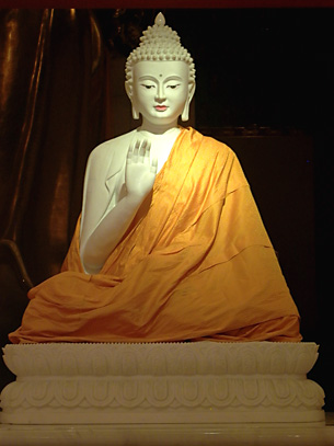 左手仍持缽,右手掌心向外,舉示於胸前,是為「放光印」。在甚深禪定中,放大光明,剎那宇宙皆在光網加持中。迦那迦牟尼佛說戒偈: