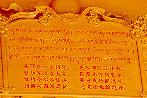 在閻羅與大圓輪外圍,則是另一番不同的景象。上方有日輪、佛、祥雲,右下角有長者、樹、岩石、河流、鶴、鹿,合稱「六長壽」,象徵康祥寧壽;左下角是松雞、兔、猴、象,稱為「和氣四瑞」,象徵友愛與互助。教導世人,幻化人生,假有修真。右上方一位佛陀指向前方,說出八句偈,指示如何出離這六道輪迴枷鎖幻象。 善行之初棄諸惡,趣入佛陀正法教。 |