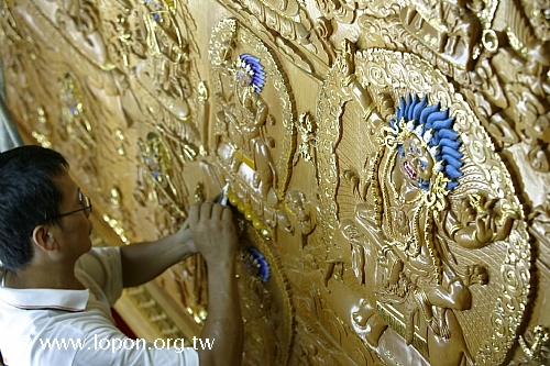 藏密藝術 > 木雕巧藝 > 三根本木雕 > 護法 三根本木雕-護法 (佛行事業的保護者) 瑪哈噶拉佛父佛母為中央主尊。瑪哈噶拉是觀音菩薩的化身,二臂大黑尊者,為噶瑪噶居傳承最重要偉大的智慧護法。護法之所以示現威猛恐怖的忿怒形象,是為了保護佛法、調伏眾生剛強頑劣習氣,並遣除修行障礙,並非兇惡。 瑪哈噶拉有三眼,象徵見一切三時。四顆犬齒,象徵降伏四魔。怒髮衝冠,象徵帶領一切眾生成佛。頂戴五骷髏頭與五寶石,象徵五方佛。穿著虎皮裙,象徵調伏一切眾生之我慢。以蛇為嚴飾,象徵調伏眾生之瞋恨。右手握持新月形彎刀,象徵調伏一切眾生的我執。左手捧顱器噶巴拉,象徵了達法性。內盛鮮血,象徵調伏眾生之貪欲。口中發出叱吒巨響,象徵以大悲心守護一切眾生。安住於智慧烈焰之中,象徵調伏眾生之煩惱。 |