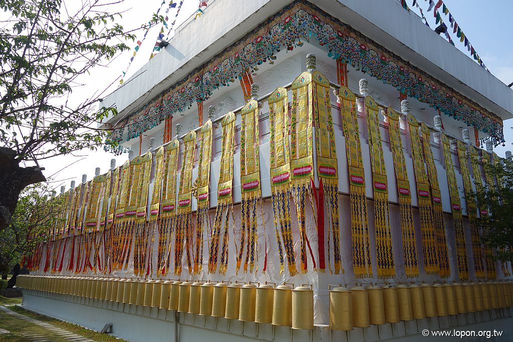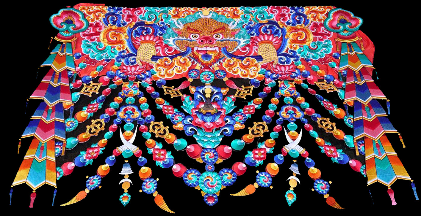 舍利塔外莊嚴札哇札節。是一塌鼻獸吐出七鎮八寶與飄帶串聯成華麗如花鬘之莊嚴。往昔 藏人一針一線縫製。舍利塔這件亦是隆德寺阿尼寺院的尼師們縫製所成。十餘年來,每當法會節慶,總高懸於塔四周。十分優雅飄逸。常年風吹雨淋,而今已不堪使用。時難再找人縫製。改以電繡。首幅樣品已經完成。 環繞聖塔四周需要36件。每件認供臺幣25萬元。即日起接受信眾供養。每件中央處將可繡上一位供養人芳名。