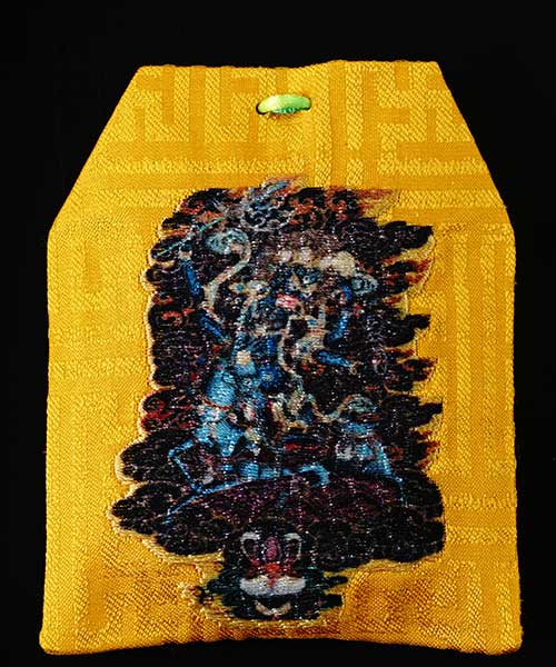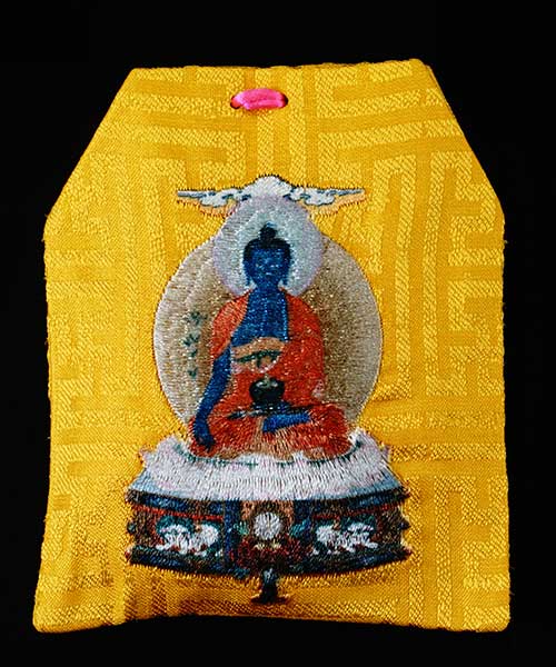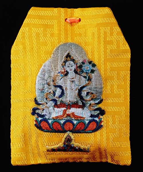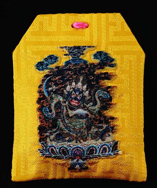 今年新製五款吉祥袋,保護之神瑪哈噶拉、延壽白度母、護衛之王善金剛、藥佛藥師如來、三界之母瑪哈噶哩。內裝8克上等純沉香,無法點燃,必須混合低燃點的香末才能點燃。純天然沈香聞起來並無香味,不要誤以為這是一般香末。此等十分珍貴,收藏於錦盒中,每天可以更換不同本尊的吉祥袋隨身,除祟護身增長與人接觸善緣,尤其不被遊魂鬼魅所纏,久戴容光煥發。這是噶瑪寺最具代表性的加持物。
