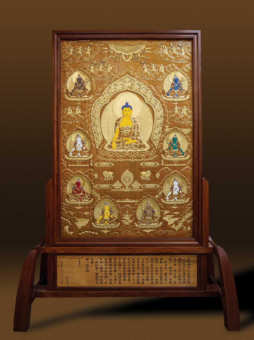 佛屏的創作,借鑑取材清代紫禁城《梵華樓》,2012年禮請不丹唐卡畫師袞桑旺秋繪製素描,神筆轉折,另闢蹊徑。以此為本,委託雕刻大師王瑞泓團隊,以台灣檜木製作淺浮雕,2014年完成,巨匠斧鑿,含蓄深厚。接續箔金,彩繪師郭佳琳巧敷丹青,更為莊嚴典麗。永興公司製作花梨木框座,大器穩重。2018年圓滿,妙寶聖像,於焉莊嚴問世!
