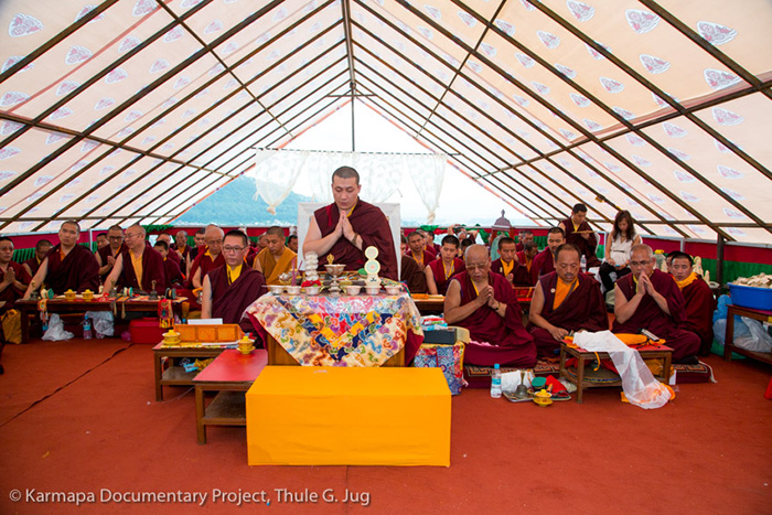 前方一:由至尊第十七世噶瑪巴大寶法王聽列泰耶多傑、台灣噶瑪寺赤巴 尊貴的洛本天津仁波切、香巴仁波切、桑桑仁波切、薩曲仁波切、喇嘛謝拉嘉辰仁波切、聽列祖古、卡登仁波切等,領僧眾修持紅觀音法。