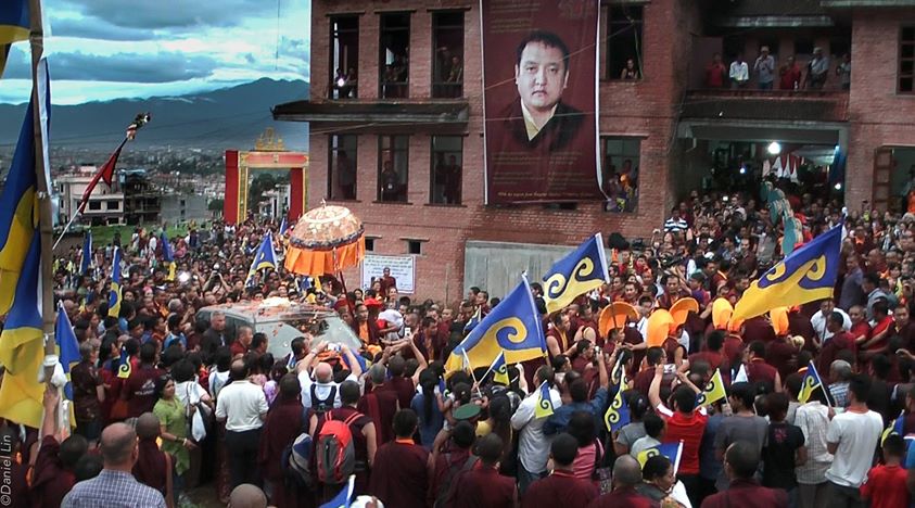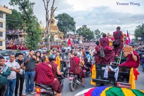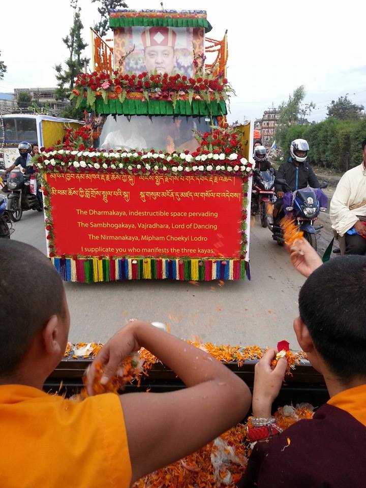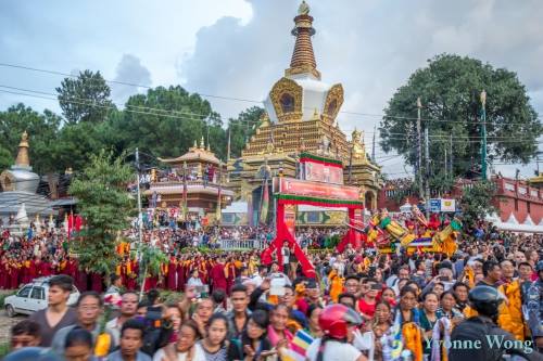 7月29日下午夏瑪法王聖體抵達尼泊爾加德滿都。家師仁波切如是說:「延途警力戒備護衛、萬民夾道瞻仰法王。短短兩里路,開了五個小時。在雨季中,天空放 晴僅於法體見天時,空行灑落雨花。一路瑪哈噶拉顯化神跡護駕!」法王聖體繞行神聖的「索揚布」自生佛塔(Swayambhu Stupa)。長號、鐃鈸法樂高鳴,燦爛幢幡莊嚴,車駕緩緩前行,虔誠與信心交織而成感人畫面。