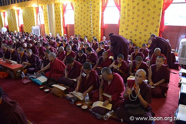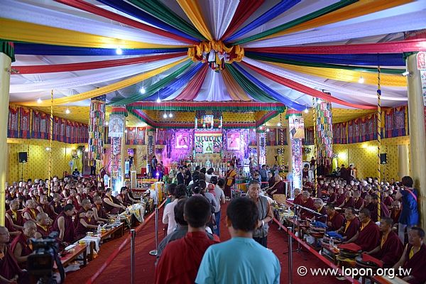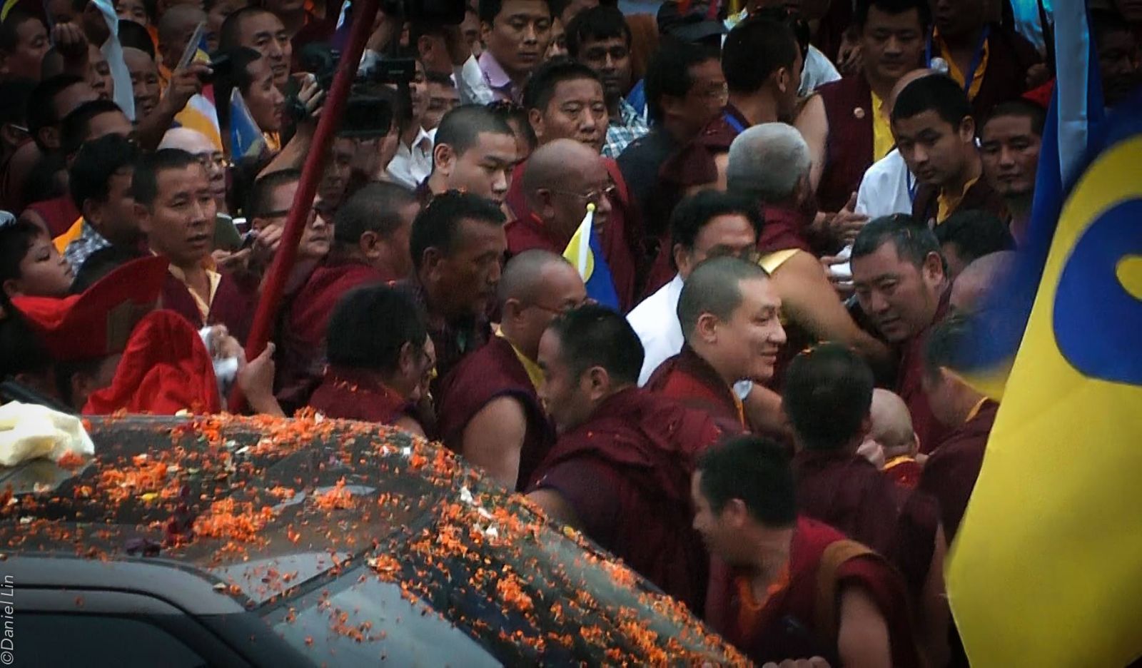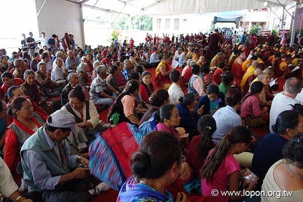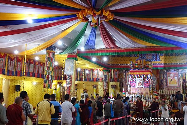 大殿內,聚集各國僧團修法。大殿前,擠滿來自全世界各地的金剛昆仲,西藏、印度、不丹、尼泊爾、法國、德國、台灣、香港、新加坡……十萬人潮湧入,滿山滿谷都是法友。有佝僂蹣跚的長者,有揹著幼兒的父母,大家扶老攜幼,不遠千里而來,不畏舟車勞頓,只為頂禮上師夏瑪法王聖體,獻上最真摯的感恩與祈願。