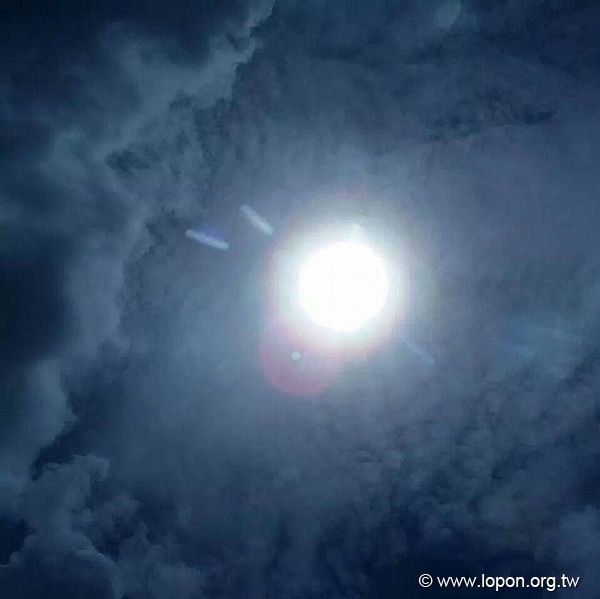 是日天氣炎熱,唯獨法王噶瑪巴法座的帷幕上方,飄來雲層籠罩,彷彿華蓋遮陽般。當三昧真火燃起的剎那,天空頓時飄降輕柔華雨,太陽就在荼毗舍利塔正上方顯現,光芒耀眼燦爛。白雲幻化美麗身影,宛如天女曼妙飄帶,令人歎為觀止!而後晴空無雲,一片蔚藍,猶如大手印之無念。舍利塔正前方,出現花朵形美麗光體!(如右圖)