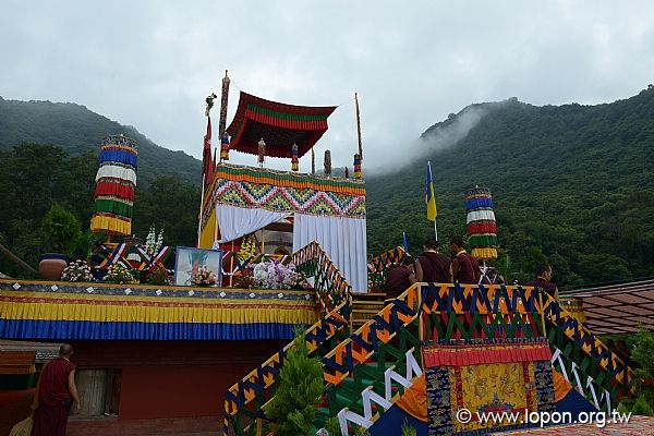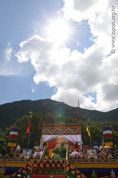 今年7月31日巧逢藏曆6月4日,佛陀初轉法輪大吉祥日,也是十四世夏瑪法王1952年降生、2014年荼毗之日。荼毗舍利塔,啟建於夏彌努佛寺頂樓,藍天白雲青山圍繞。舍利塔壇城四方垂幔,幢幡與法界旗莊嚴。