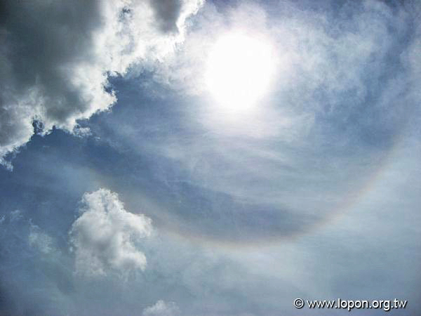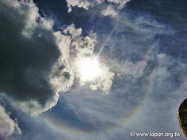 西曆八月六日,藏曆六月初十,荼毗第七日。中午十二點多,台灣噶瑪噶居寺上空,出現碩大彩虹環繞晴空麗日!圓形彩虹光圈,鮮明繽紛高掛天心,震撼視覺!蒼穹雲朵優美奇幻,湧現四方。
