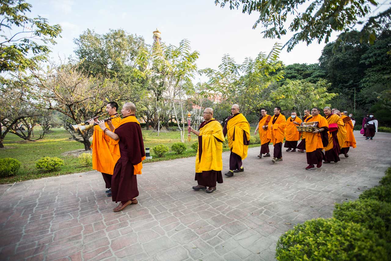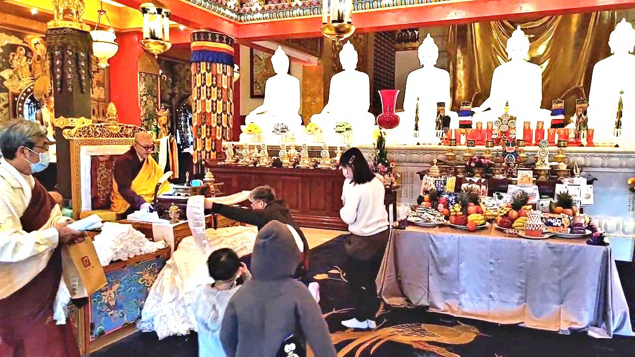 難得出現的艷陽高照,悠揚高遠的甲鈴吹奏聲中,尊貴的 上師仁波切,在喇嘛、弟子和信眾虔敬的迎請,開啟了元旦祈願供佛法會的序幕。