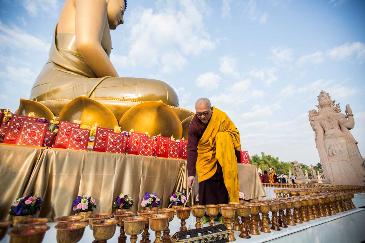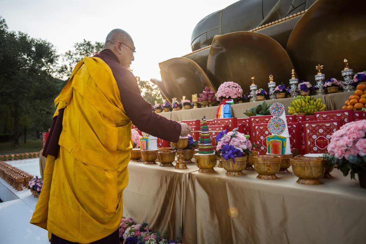 尊貴的 上師仁波切在微笑阿彌陀佛佛像前,頂禮阿彌陀佛、點燈、上香、帶領喇嘛和信眾,虔敬的獻上盛大豐盛的薈供,七政寶、八吉祥、伽楠沉香、八功德水、血龍木燈、各式鮮花、水果、美味妙饌,更有精心製作的文殊智慧餅等。