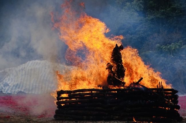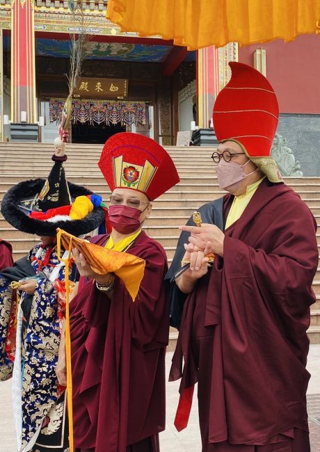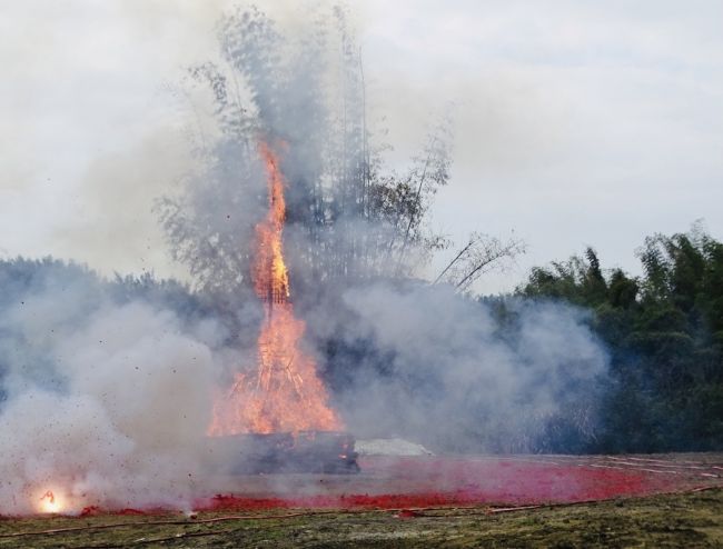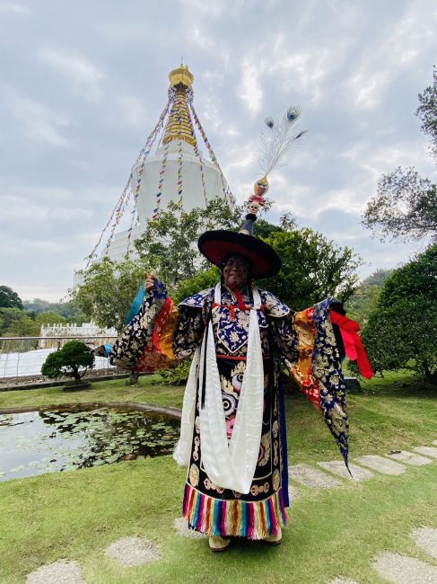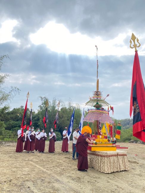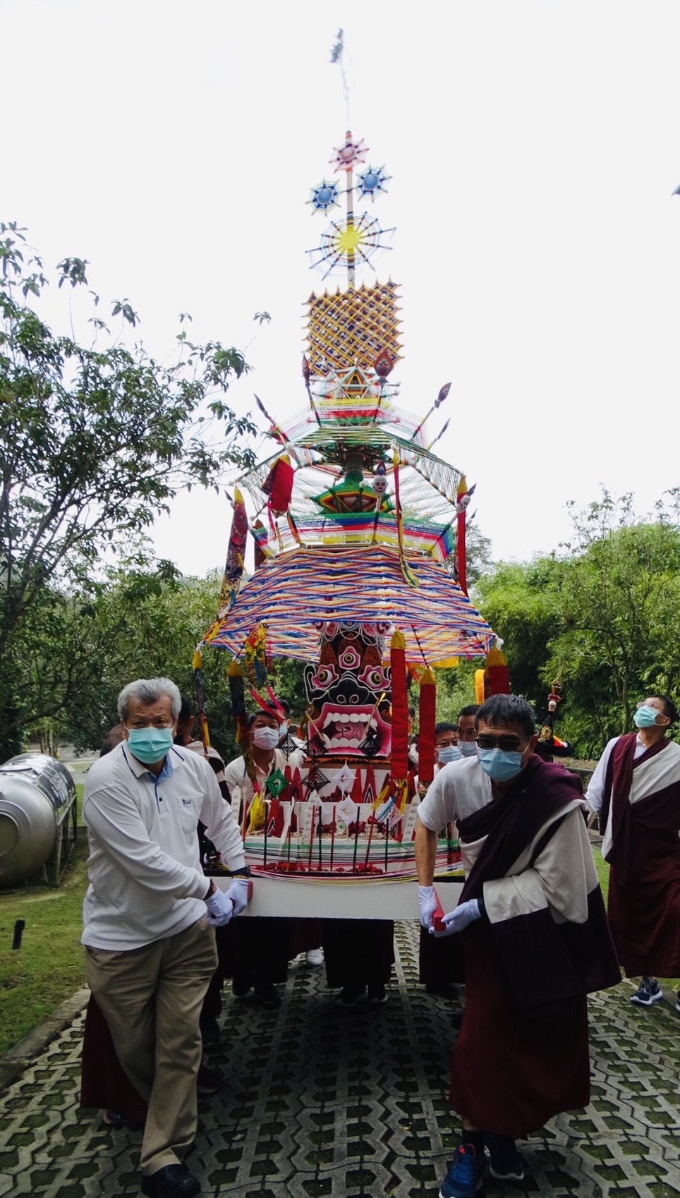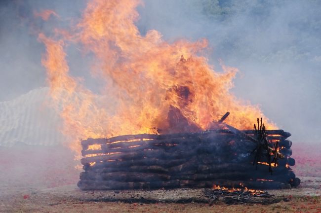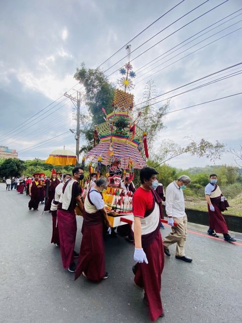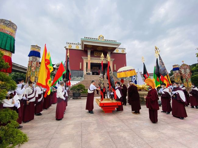 除夕下午大黑臉譜多瑪,由金剛護法翁朝棟與金剛昆仲,聯手請出如來殿。儀仗隊伍與喇嘛吹奏甲玲,鑼鼓喧天前導至火供場。觀修儀軌喇嘛穿戴金剛舞衣,燃起烈焰火化多瑪。在主幹傾倒點燃炮竹聲時,大黑聖者吞噬弟子們的業障與傷害佛法諸魔,超度至淨土。火燄中顯現觀世音合十為蒼生祈禱⋯⋯