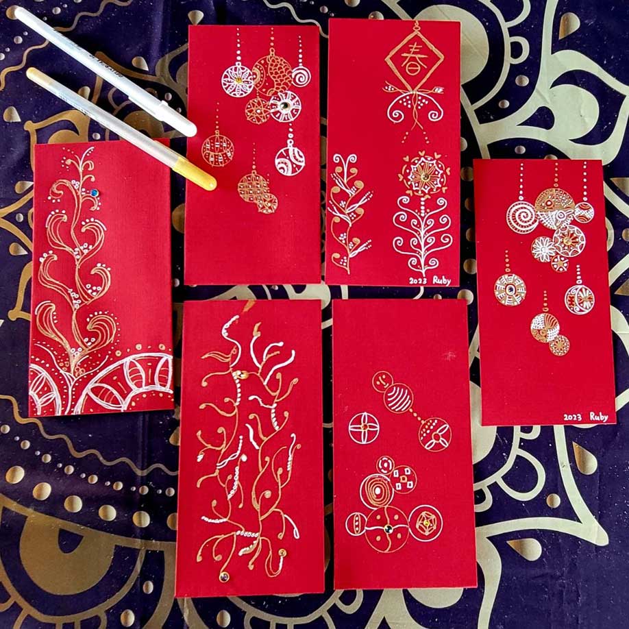 禪繞畫鎏金紅包袋──金露般的色彩,揮灑在紅包袋上,細膩柔美的勾勒筆觸,貴氣躍然,富麗飽滿。在靜心專注中,看見自己的心,原來這麼神奇。唯終究如《華嚴經》云:「心非彩畫色,彩畫色非心,離心無畫色,離畫色無心。」