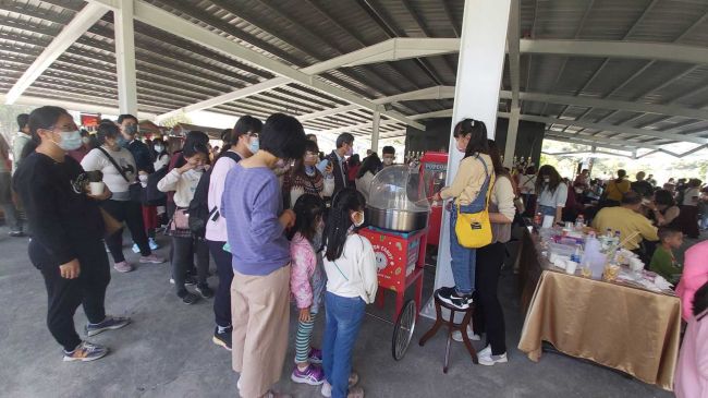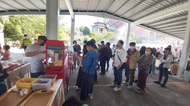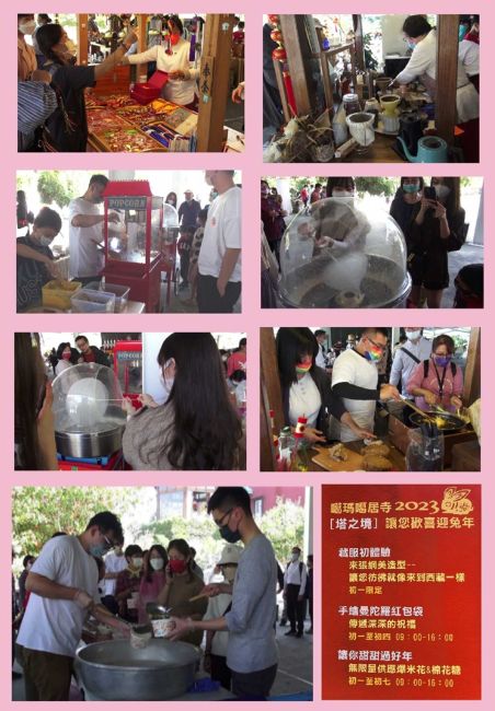 寺方提供炸年糕,懷念的古早味,遊客歡喜大快朵頤!現做爆米花、淋上蜜糖,酥脆香甜好滋味。小朋友吃了一盒又一盒,直到心滿意足。雞蛋糕烘焙,純淨有機材料,吸引好多聞香而來的遊客嚐鮮。童趣棉花糖DIY,孩子們大排長龍,有吃有玩有夠盡興!