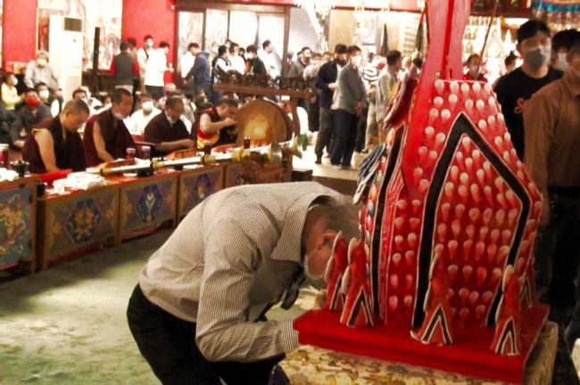 上師仁波切主法,與喇嘛們修持煙供儀軌,依此供養三寶三根本,能平息修行之違緣,消除不淨晦氣、疾病、魔障,令壽元福德祥瑞俱增長,世界和平安樂。