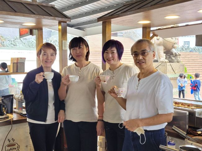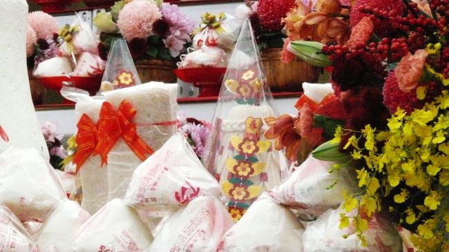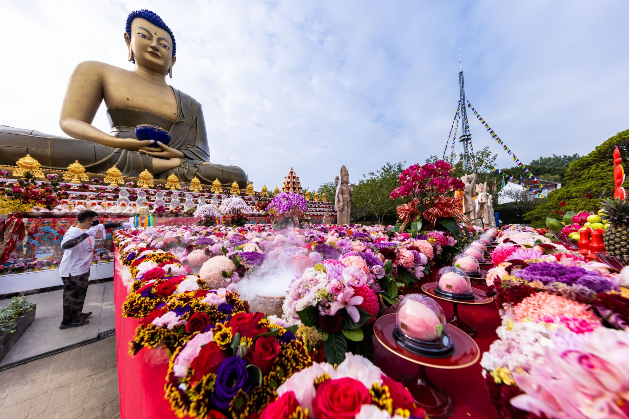 阿彌陀佛大佛前,獻供薰香、鮮花、油燈、七政寶、八吉祥、八瑞物,以及各式奇珍異果、檀香薰爐、花團錦簇、瑰麗紛呈……。實設及意緣觀想,幻化為普賢雲供,無量無邊不可思議。