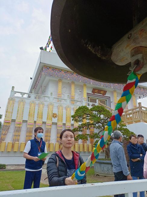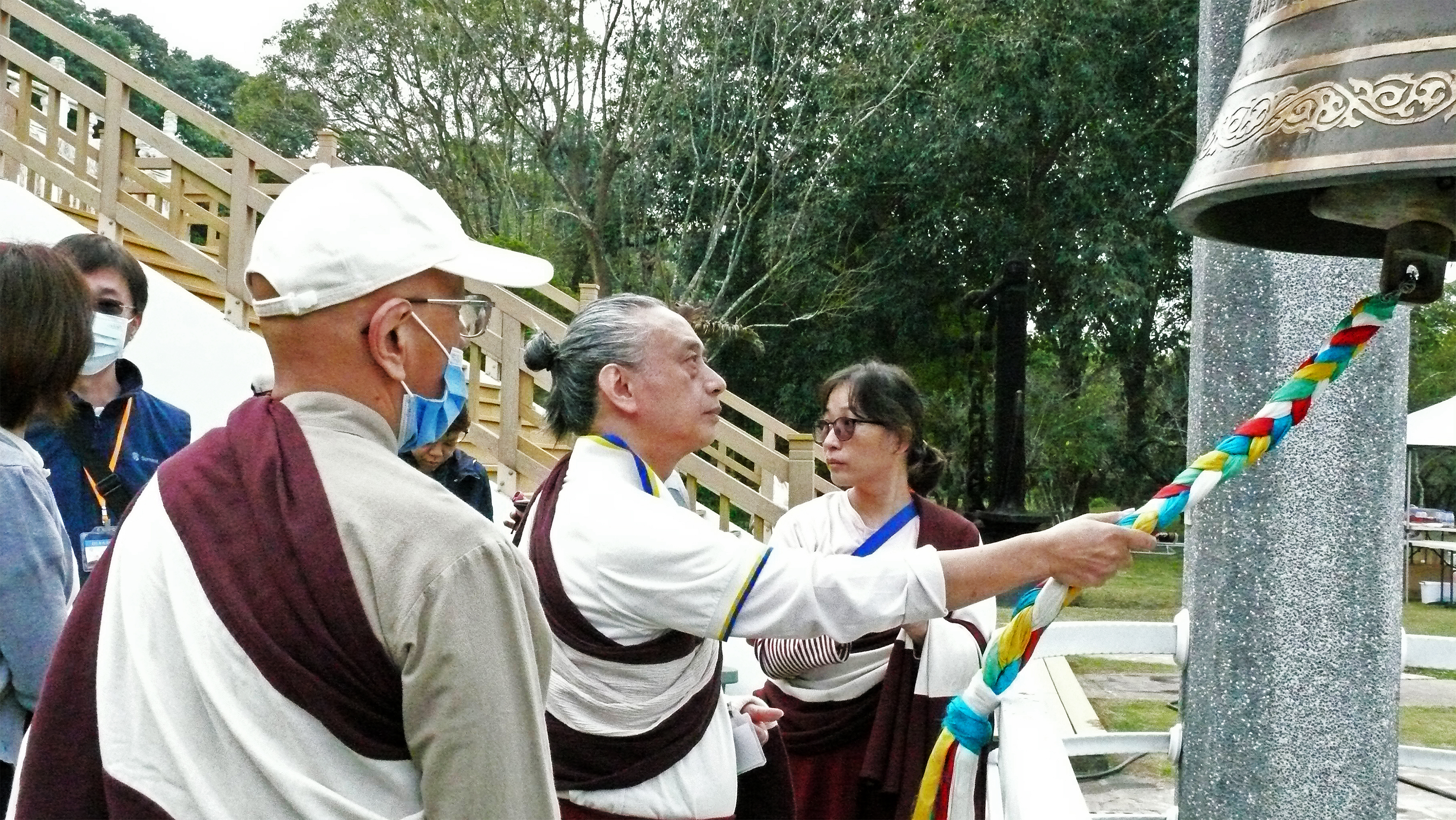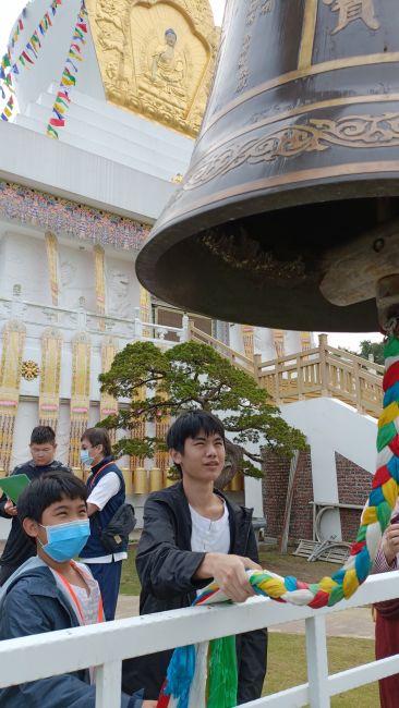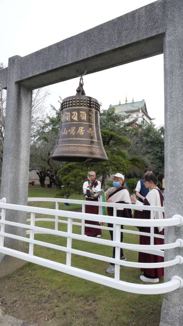 舍利塔前的梵鐘上面,刻有觀音六字真言與般若心經,梵鐘迴盪之際,叩鐘功德為眾生祈福,地獄、餓鬼及畜生聞聲獲得加持,一時解脫痛苦。