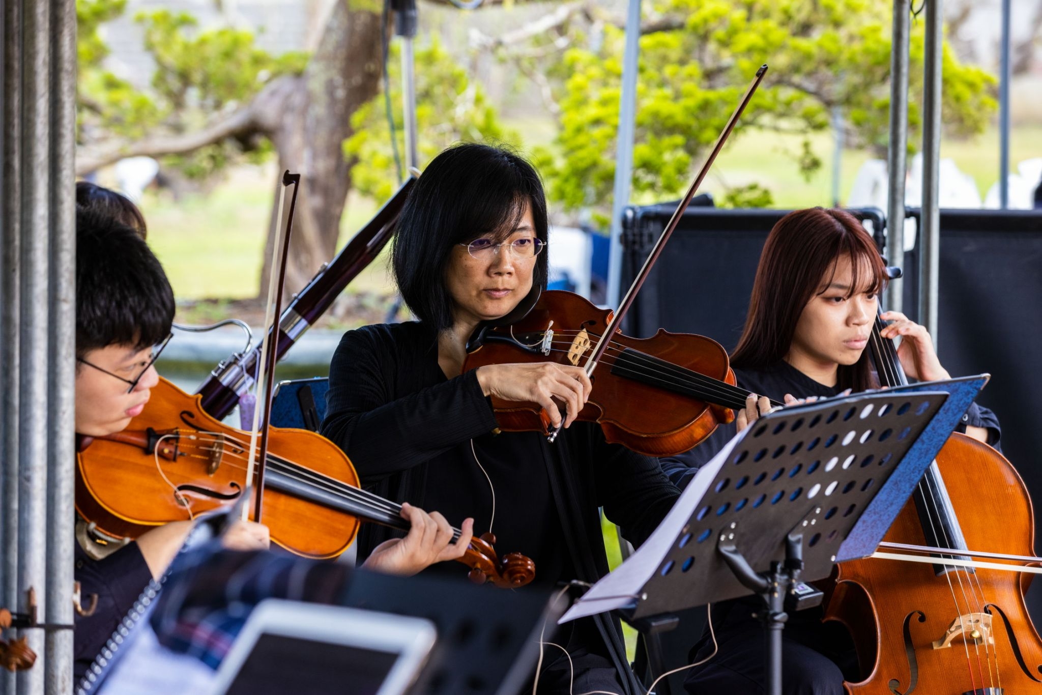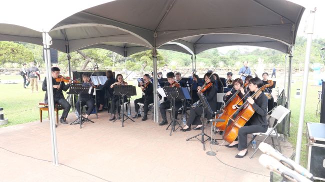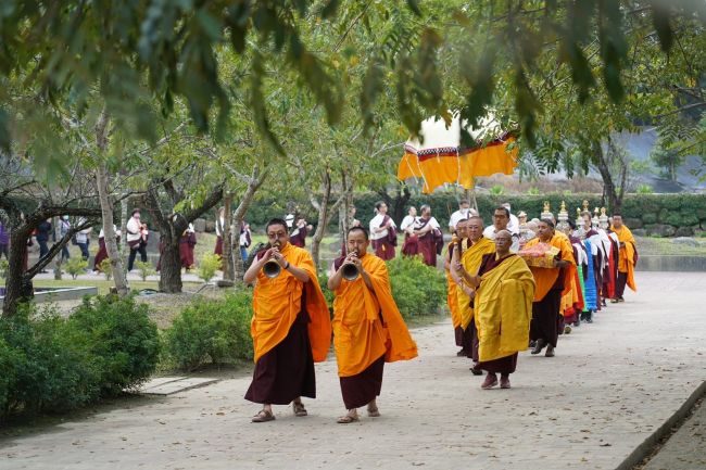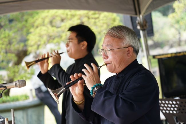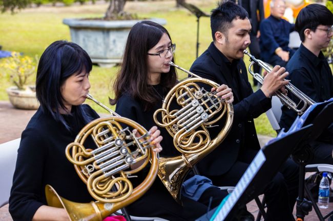 西樂樂師們虔敬地在佛前獻上美妙的音樂,供養 上師仁波切與諸佛菩薩。輕快優美的音樂旋律,使全體僧俗沐浴在獻供美樂的境界,每個人內心都充滿了喜悅。