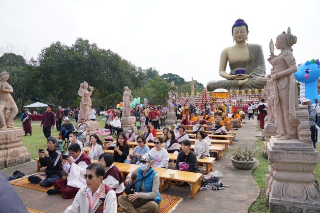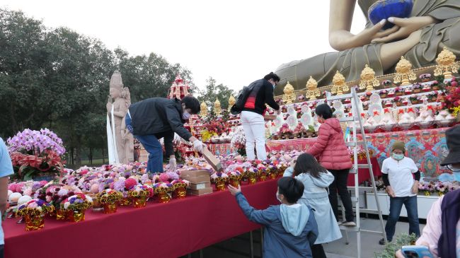 元旦大日無量壽佛晏法會於元旦吉時莊嚴隆重的展開,尊貴的 上師仁波切帶領眾多圓滿觀音齋戒,持守戒律清淨的勘布、喇嘛,和弟子們,與來自四面八方的信眾們,來到阿彌陀佛大佛前,恭敬獻上如普賢雲供般的薰香、鮮花、油燈、七政寶、八吉祥、八瑞物,和象徵平安長壽,國泰民安的壽山、桃山、奇珍異果,供養十方三世諸佛與阿彌陀佛淨土聖眾。