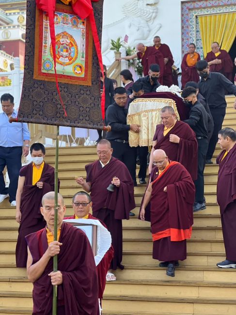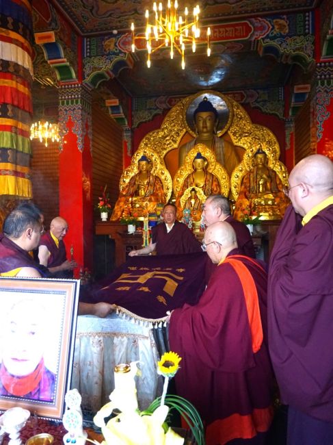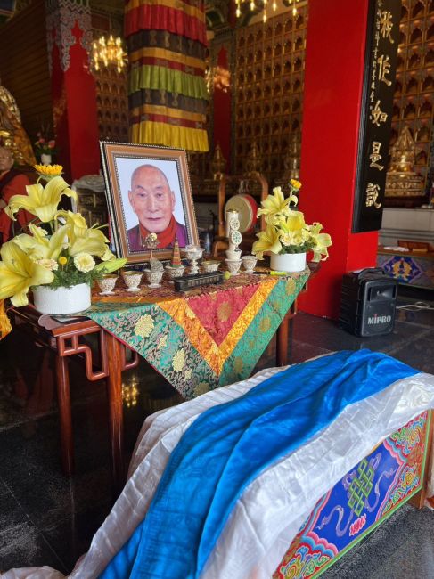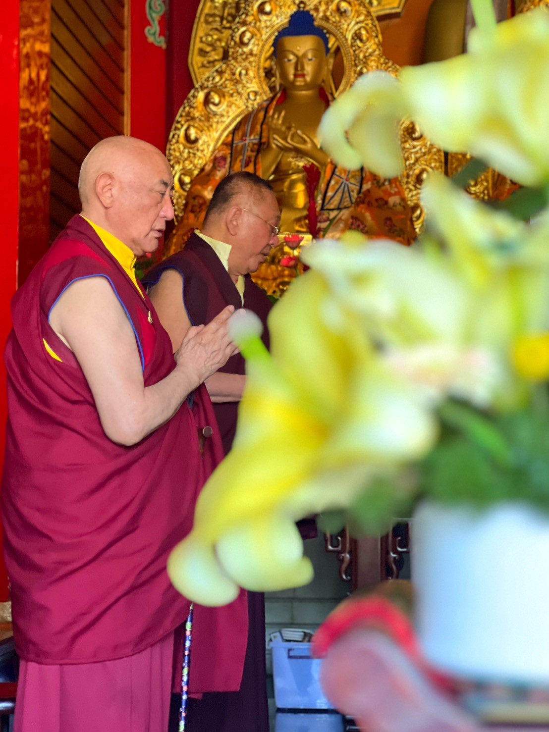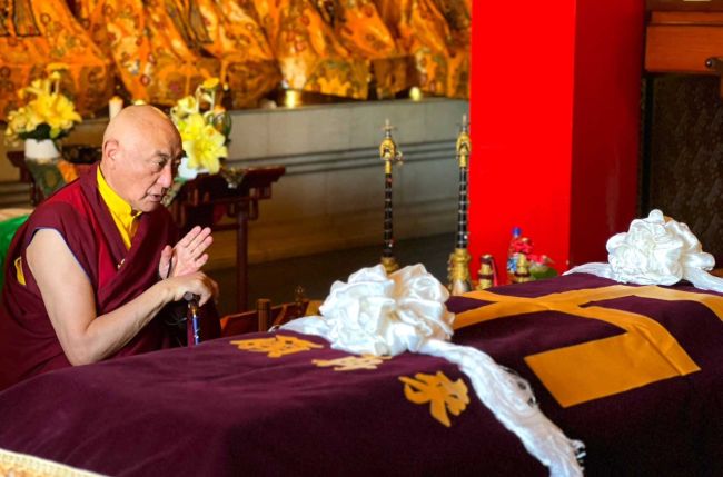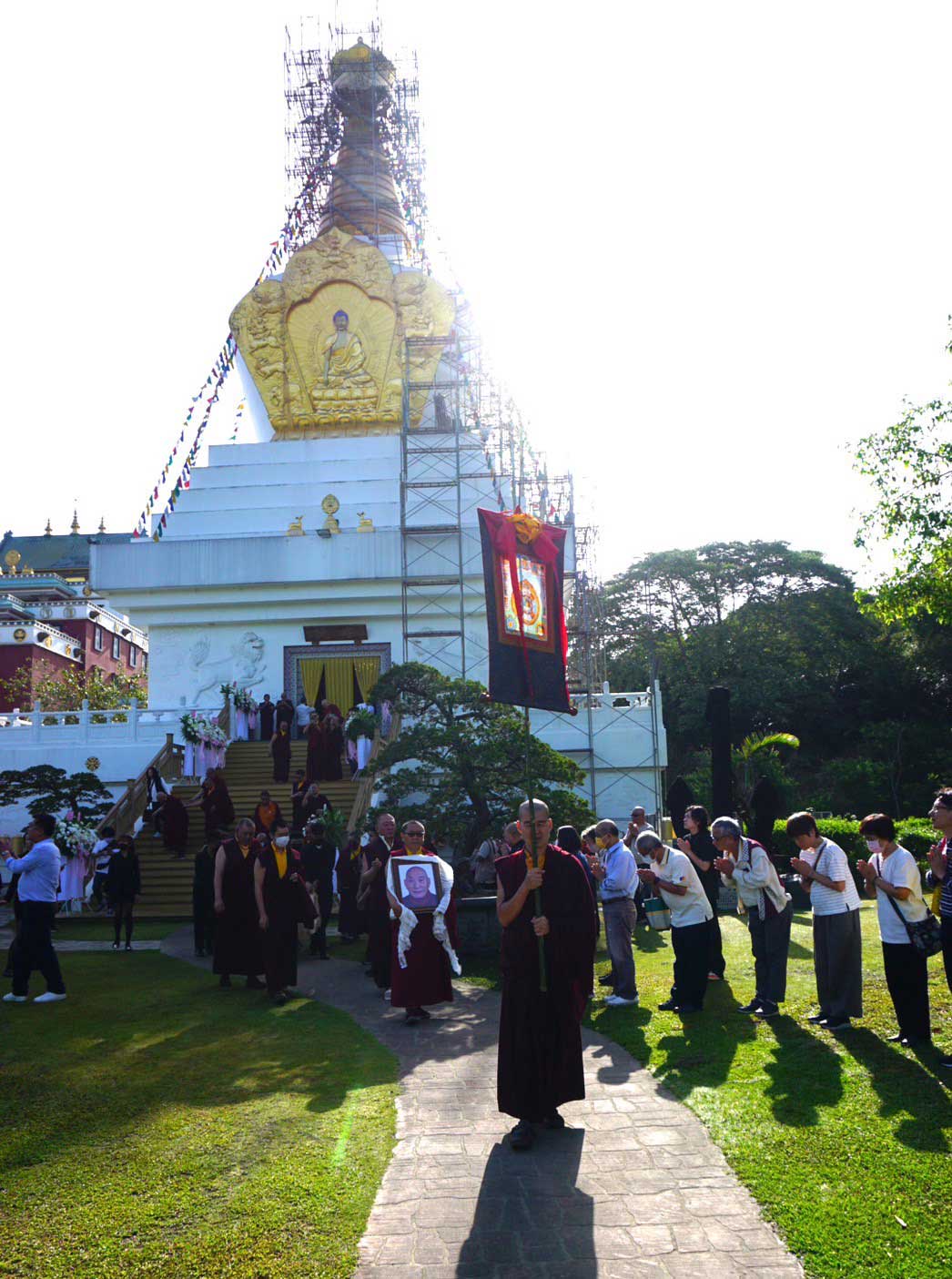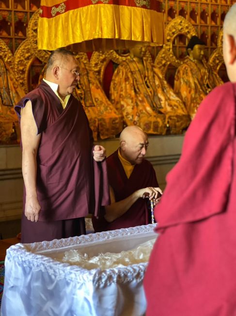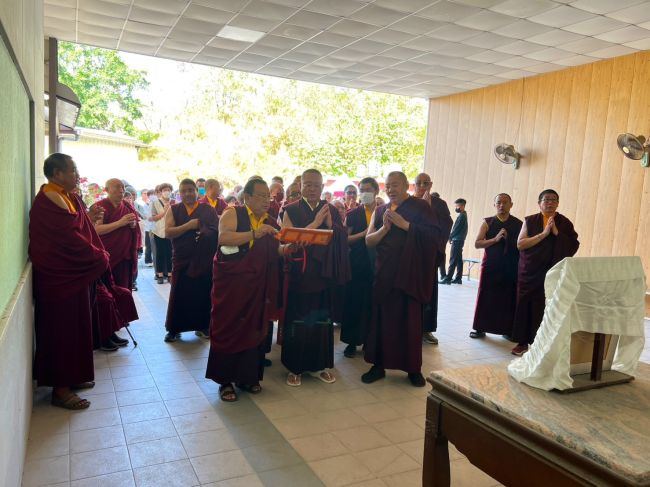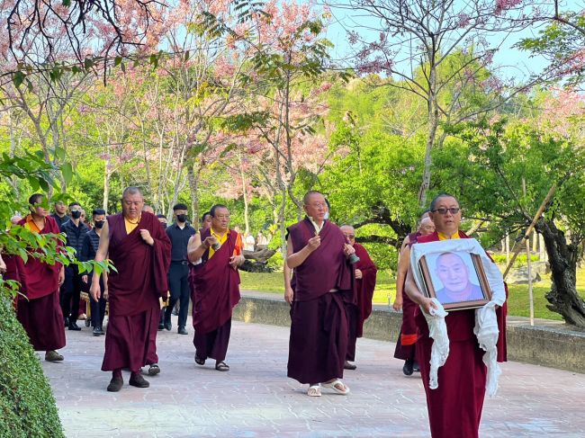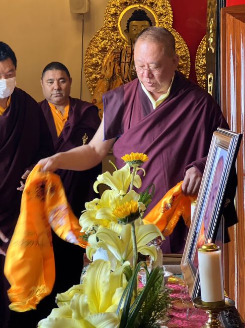 上師仁波切協助長老設靈於本寺舍利塔。每日,噶瑪噶居的上師仁波切親自帶領堪布與喇嘛們於靈前修法,藉由觀修之力,清淨長老受生淨土的障礙,令善緣增上之際,蓮花化生,淨識見佛。