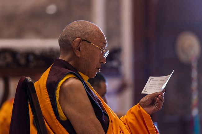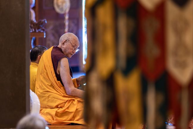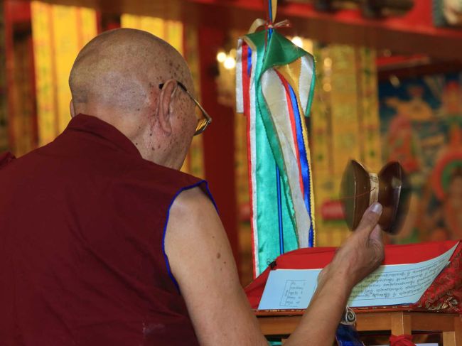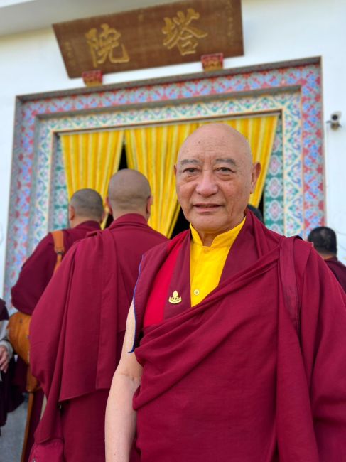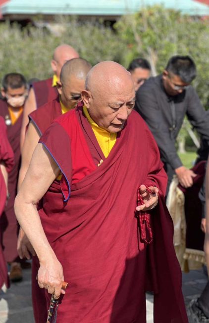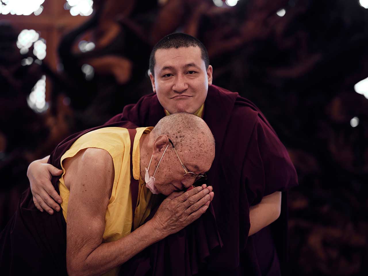 長老畢生奉獻佛法,於噶瑪噶居法脈中德望俱備,通曉經論、精通儀軌,尤擅內觀實修法門,為後學所尊仰。他遠離塵囂,行事謙遜寡言;不以年長自居,而以德行與深邃智慧默默引領後輩;他話語平實真切,目光柔和沉靜,即使年事已高不便上樓而坐在廚房等候用餐時,也總只見長老口持真言、靜默地看著喧囂吵鬧的志工們準備菜肴,然後微笑送上一句:「謝謝!」