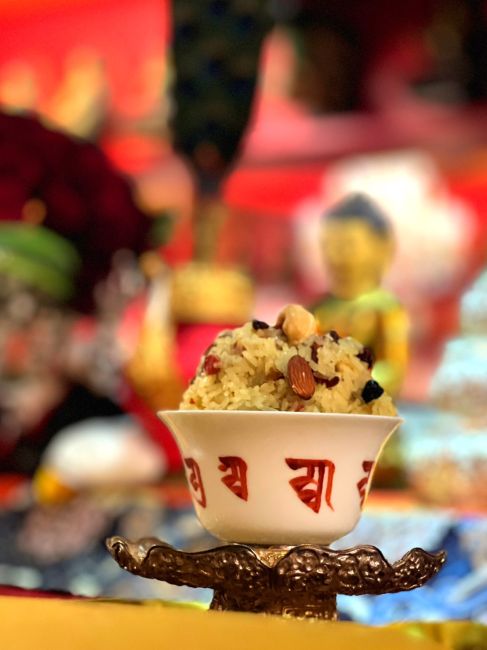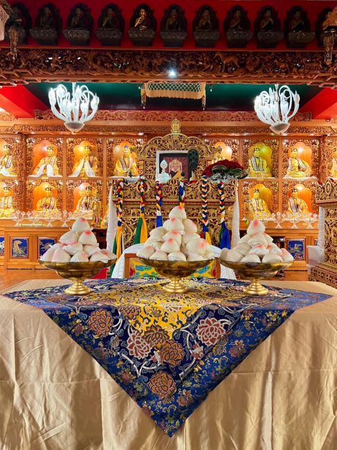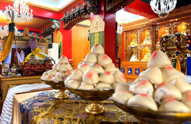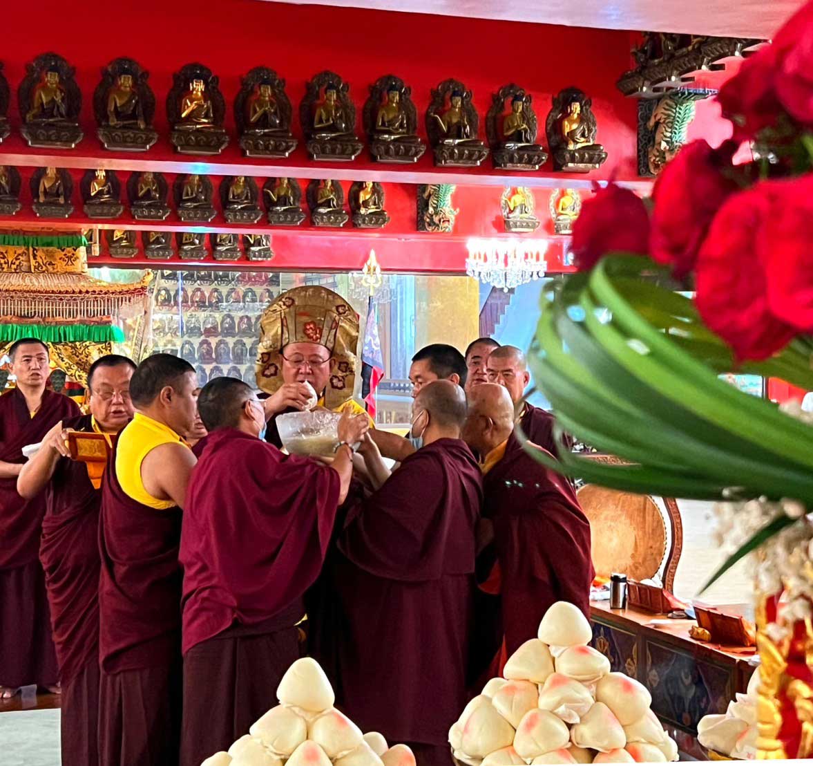 值此尊勝壽辰吉日,弟子們誠心準備台灣傳統祝壽吉祥之物──壽桃,象徵福壽綿長、吉慶增輝,並融合藏人慶典中不可或缺的吉祥飯,以白米象徵清淨,酥油與糖果象徵法財圓滿、福慧俱足。中藏融和的供品,表達弟子們深切的祝願與無盡敬意。