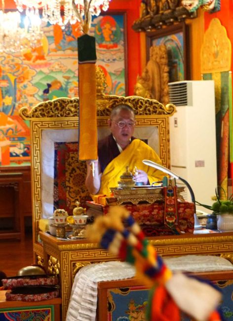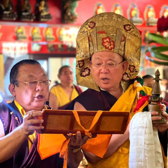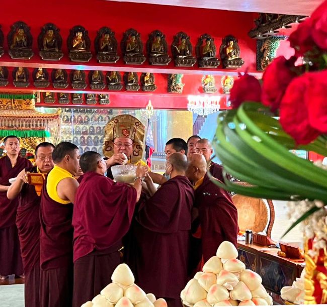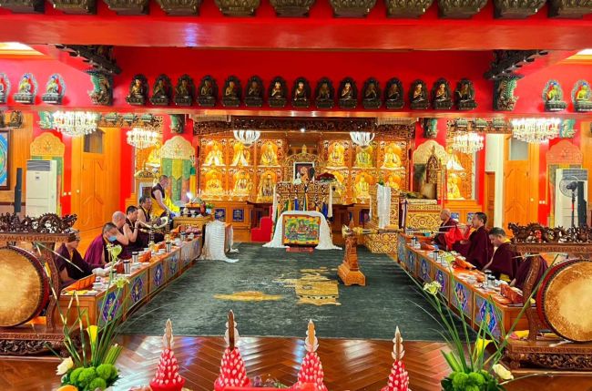 上師仁波切帶領喇嘛向法王獻供並修誦長壽佛成就法。