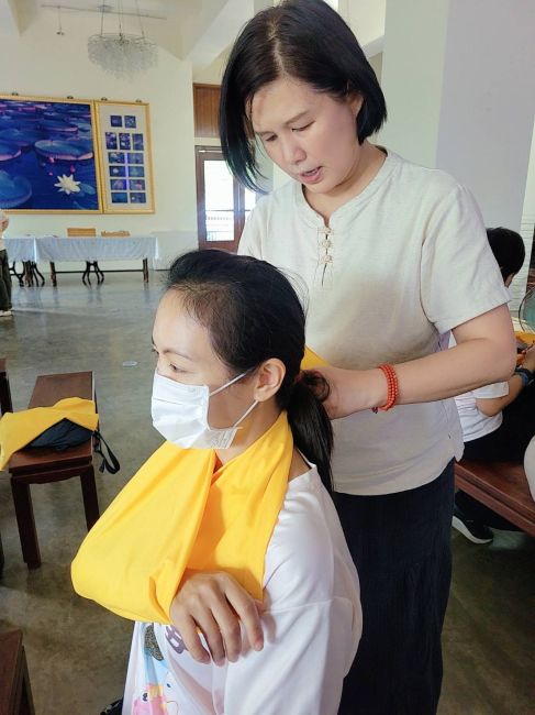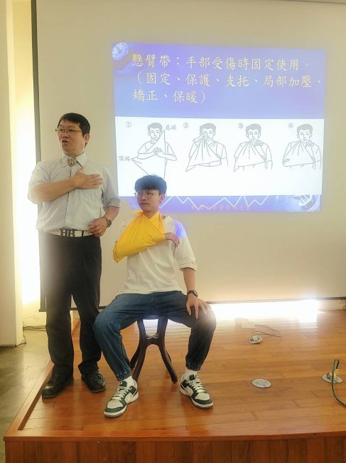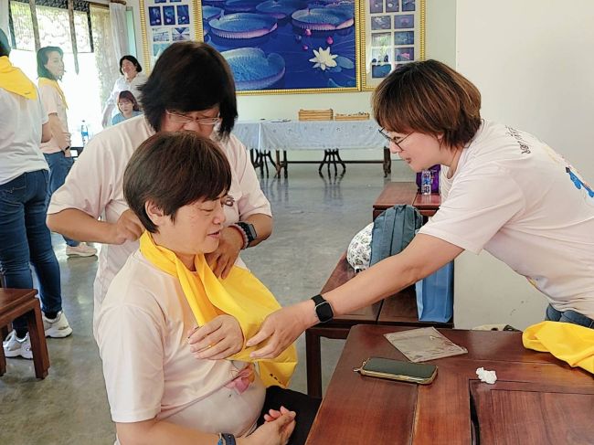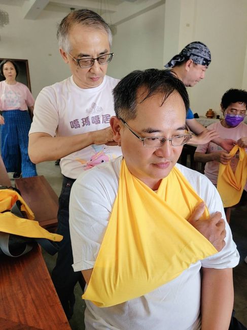 值得一提的是,本次培訓還特別製作了專屬於志工的客製三角巾。以純棉材質製成,觸感柔軟、吸汗透氣,並採用鮮明配色,每條均繡上志工名字,設計簡潔又具辨識度。未來志工回寺時只要繫上這條三角巾,不僅可作為實用配件,更是經過急救訓練的識別標誌。一旦現場發生緊急狀況,便能迅速辨認並尋求協助,大大提升緊急應變的效率。