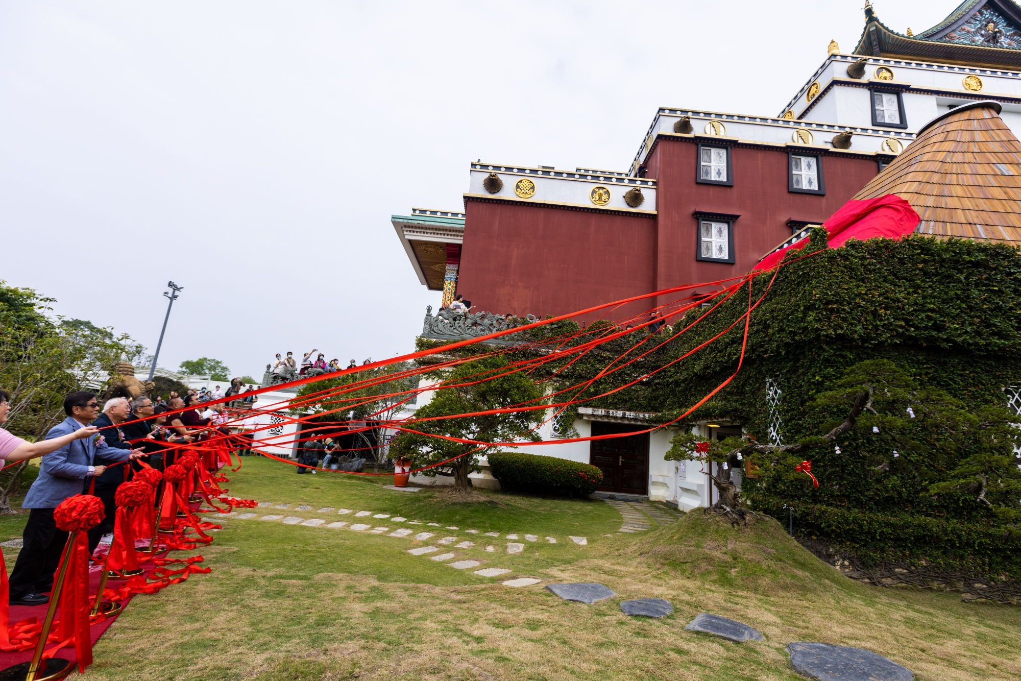 移師到觀音亭前,由亭簷拉下的紅綵,有如即將撥響梵音的弦;觀音亭的造型發想自 上師的法螺,建築大師郭旭原先生的創作,讓人好想進去一探究竟。揭紅之際,老喇嘛望向 上師,輕輕說聲:「甘露!」原來虛空中又灑下甘露雨!一些些……。