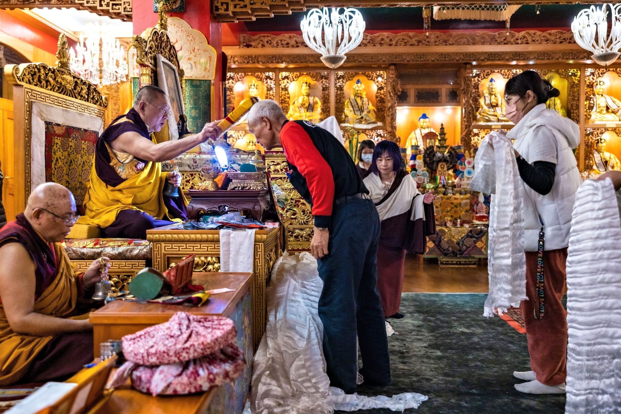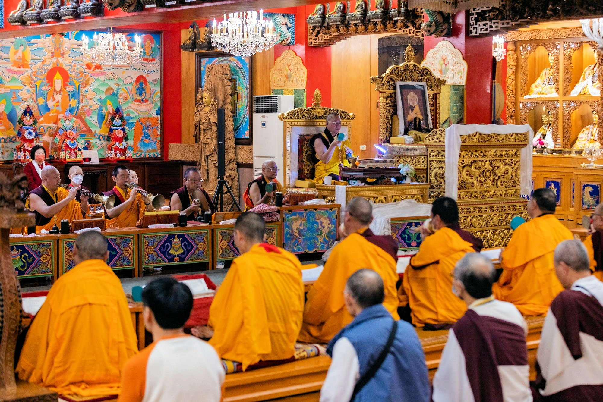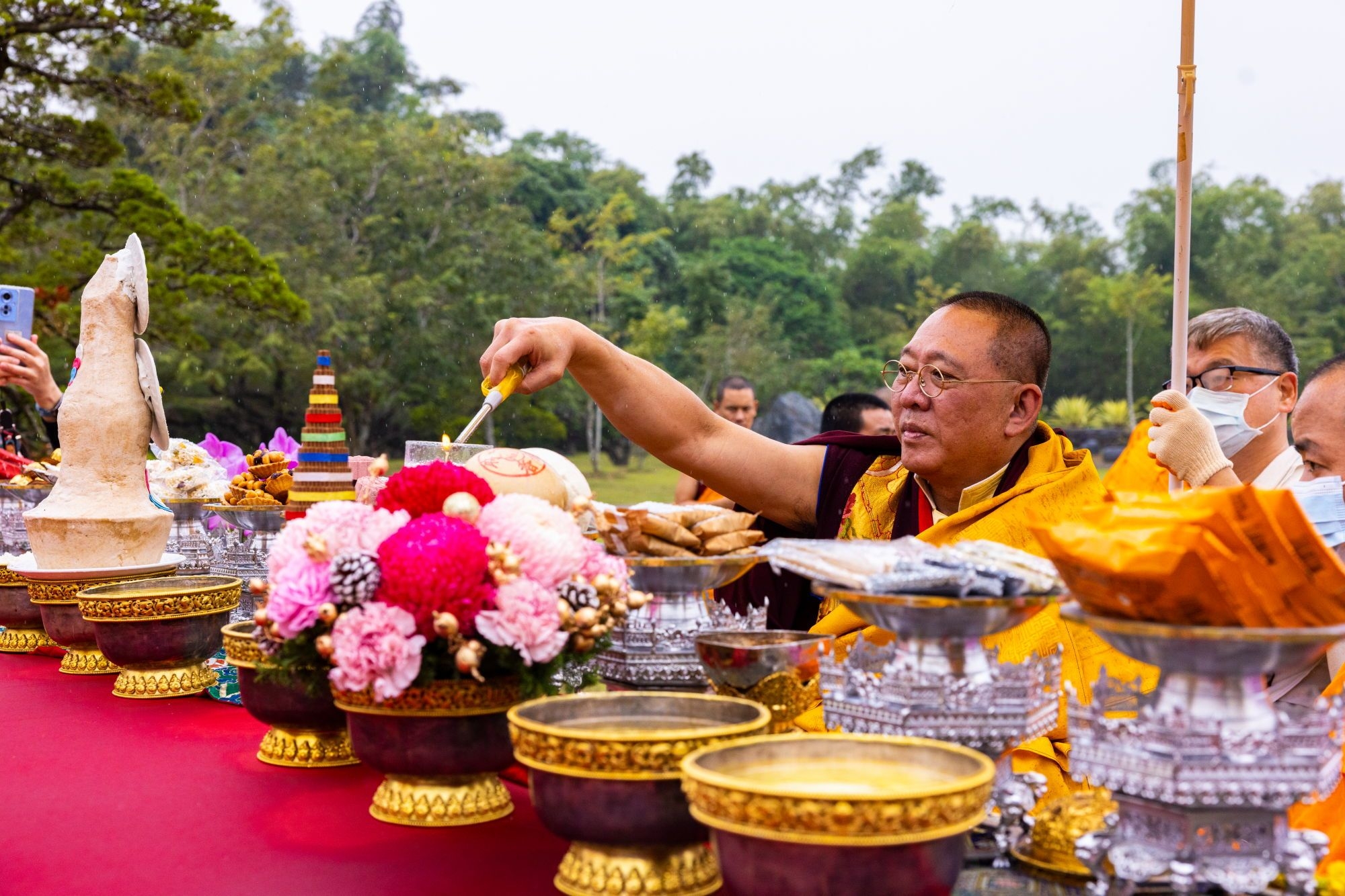為保護經文紙張不被雨水浸濕, 上師領著喇嘛們上如來殿,在講經院開啟元旦大日如來長壽佛佛宴 • 噶居上師大薈供修法。所有噶居四大八小傳承祖師一一受邀前來接受薈供,莊嚴的法樂迎請十方三世諸佛菩薩,慈佑這一方有情天地。凡心沈澱的佛子們盤起碌碌終年的雙腿,靜聆法音,飲下甘露法乳,滌淨垢染,增耳聰目明;獻純白卡達, 上師加持,添智慧受福佑。