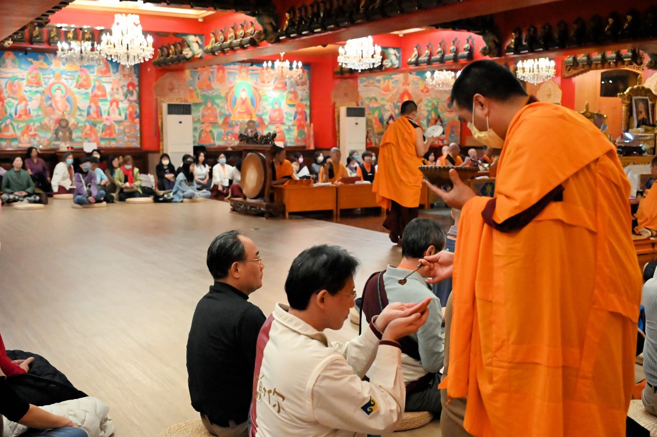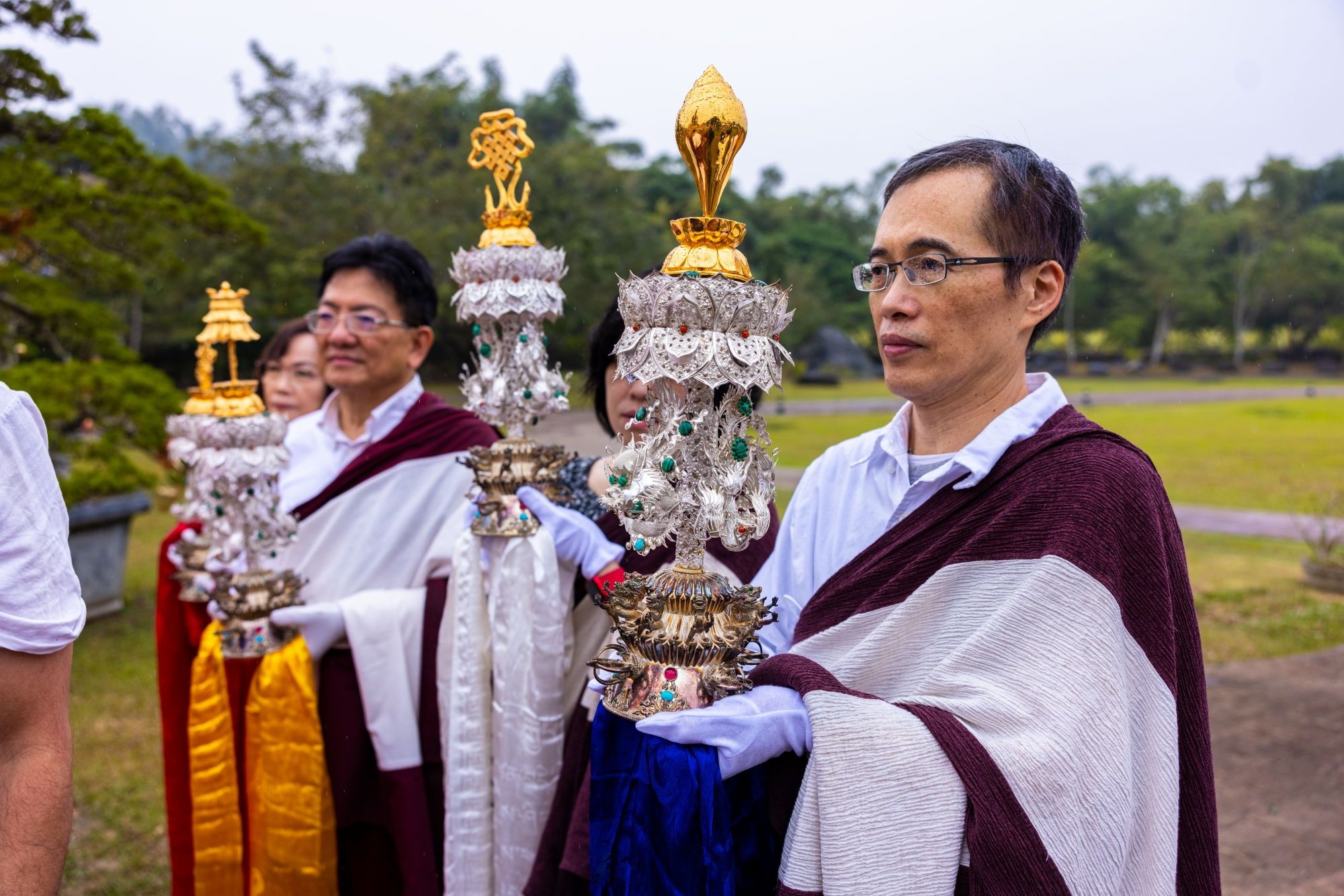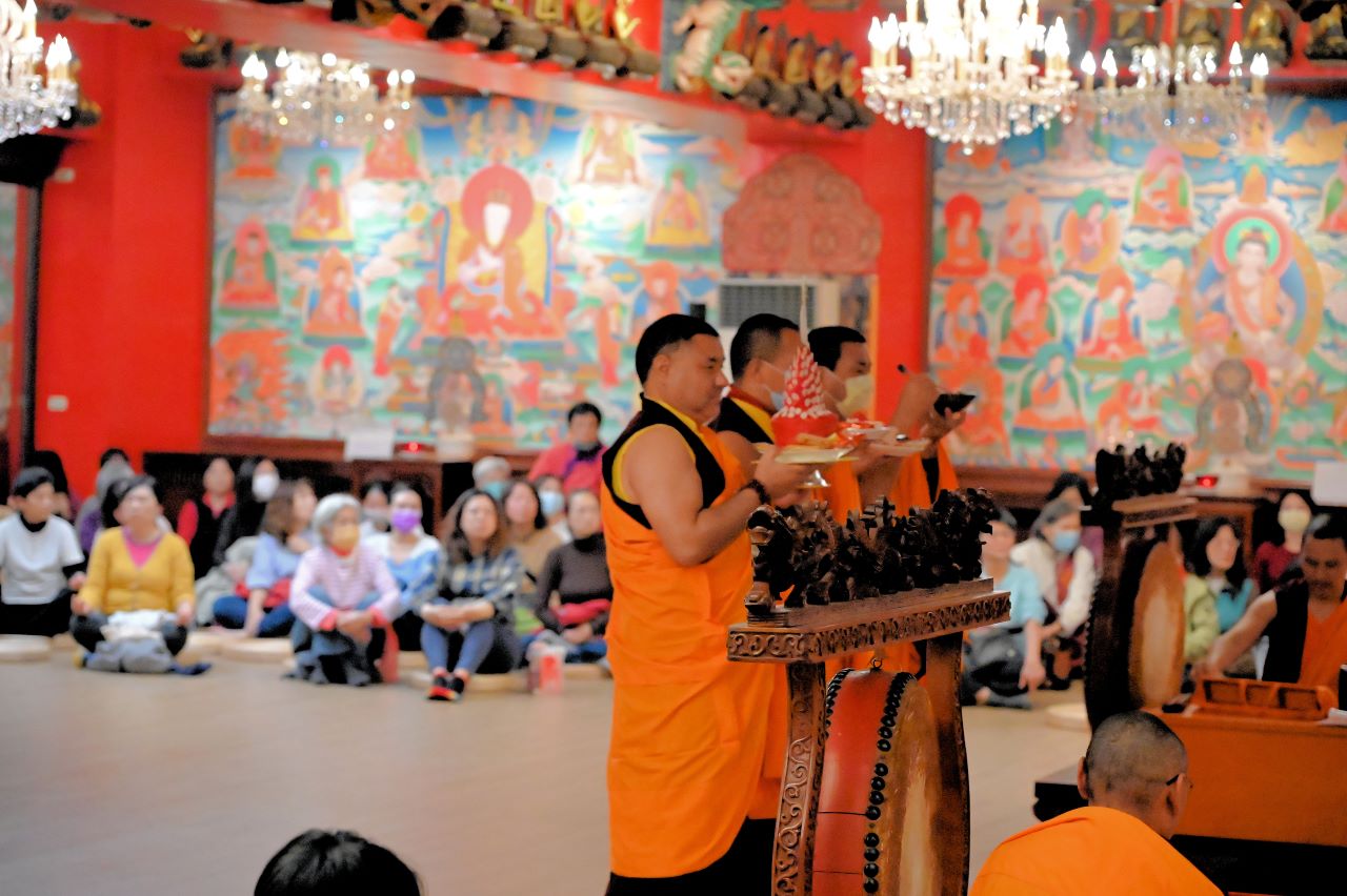 好豐盛啊!欣喜的雀躍卻停駐在 上師如鐘的教誨:「一場人間盛宴,世人所見是供台上的糕餅鮮花,我所見則是究竟無量報化二身如雲。人們祈求的是福祿壽喜,而我祈求的是,鮮活的心性能盈滿每一個人心中。」噶居家人們席地而坐,雅樂溫潤著眼見耳聞。志工師兄們客客氣氣拿著托盤:甜米糕、溫奶茶、小點心,法友信眾無不開開心心,笑靨盈盈。在樂音悠揚中,彷彿聽懂得了 上師直指心性的開示:「這是一場超越心所能想像的佛宴,甚至連佛宴都無的空性供養。」