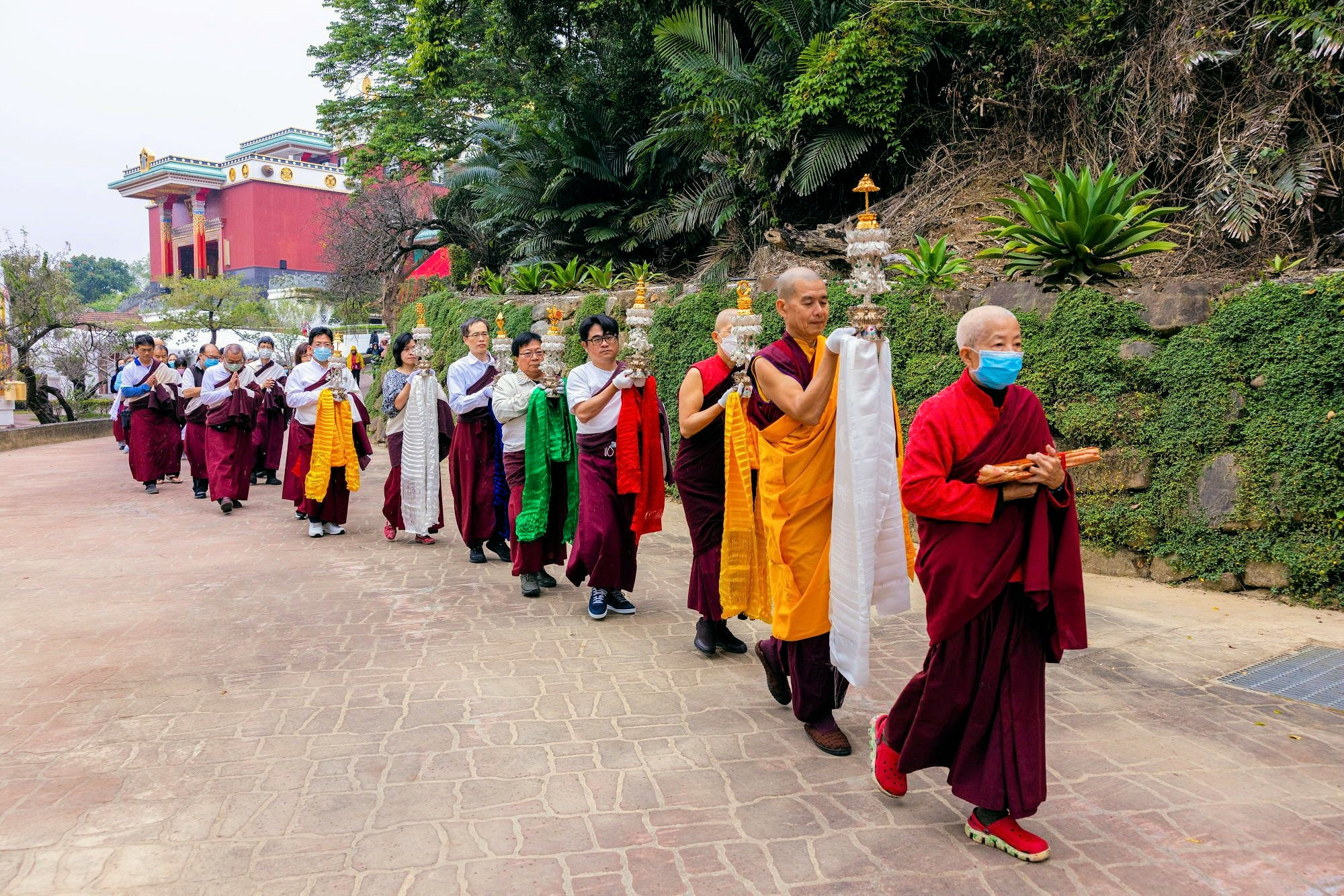 聽著自己的腳步聲,走進天色尚未啟亮的噶瑪寺,來自四方的志工早已忙碌起來。微笑阿彌陀佛前的廣場,擺供果、擺糕餅,壽桃山、米糕塔,五顏六色、花團錦簇的喜氣洋洋起來;廚房是更早就忙碌起來,鍋鏟、杯盤,穿梭的身影打從天光朦朧就毫不停歇:紐涅圓滿,師兄們要出關啦!元旦大日無量壽佛宴,貴賓們要來啦!