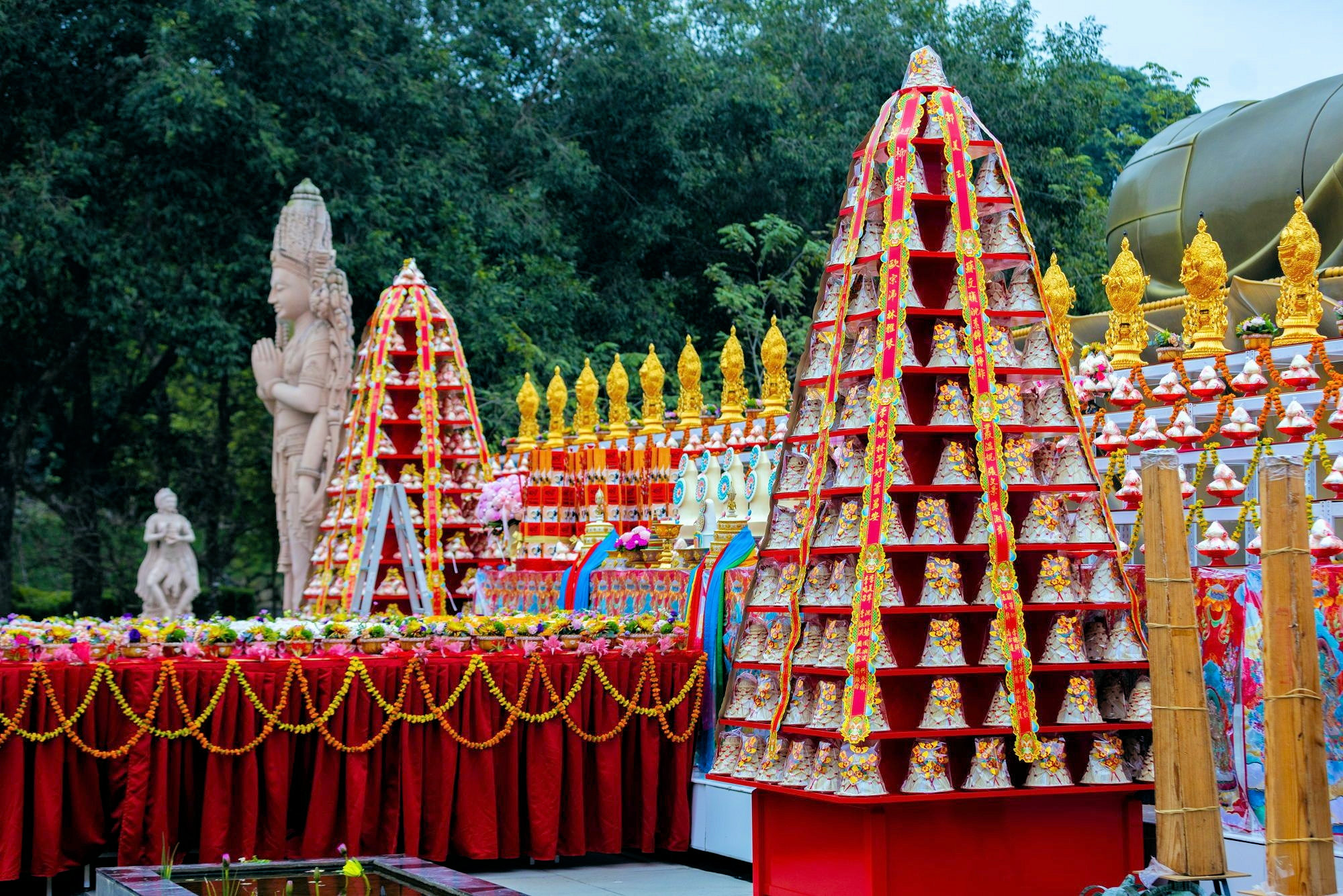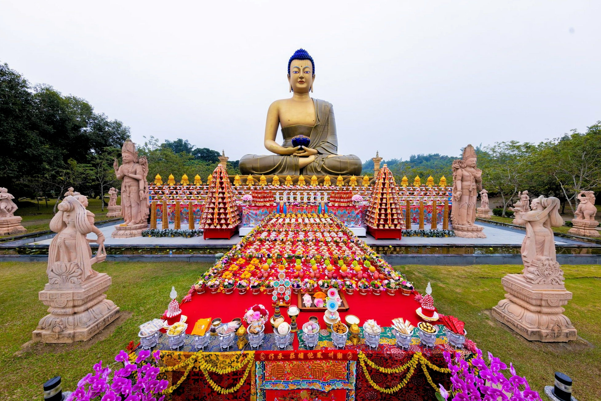 不多時,在祈禱文的梵唄中,外面天空中瀰漫著濃濃的雲朵,花雨甘露早已停歇。菩提心園內,佛宴佳餚、豐美水果糕餅,澎湃呈現;麵線塔巧妙編織著細水長流的祝福,壽桃山用心堆砌象徵生命力的增長。阿彌陀佛聖像前,七政寶、八吉祥、八瑞物,匯聚十方心念的普賢雲供,在石雕天女曼妙婉轉的起舞身影,在虔誠信眾的合十祝禱;此際,宛若淨土。