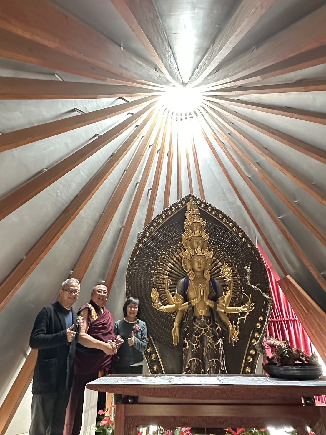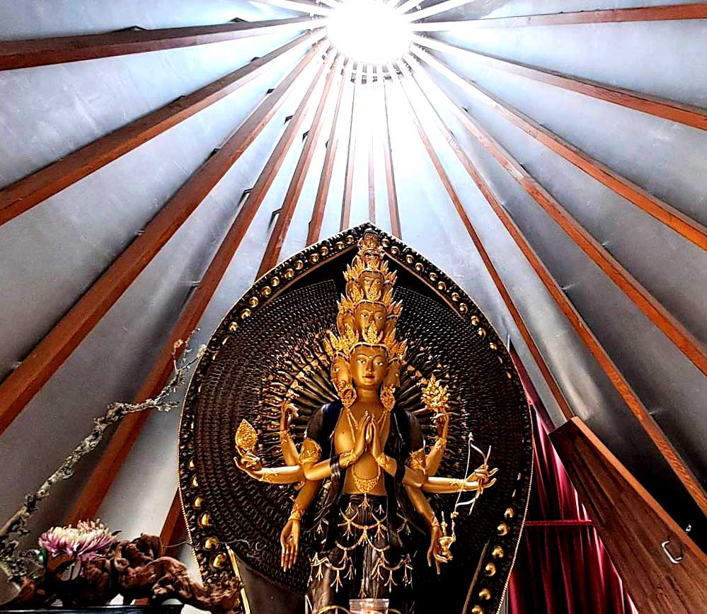 進入亭中,千手千眼觀音在前。剛剛圓滿千手千眼觀音紐涅法會,面對聖像,特別有種親近和感動。亭不大,但進入亭內,由上而下的天光和由外透入的光亮,視覺卻大。上師仁波切說:「以佛像的莊嚴分別破世俗的有染分別。但願眾生進入此亭,抬頭仰望天空,為佛光所攝,依此獲得心自光。」試著凝神感受,卻猛然想起 上師曾說過祖師密勒日巴的故事:牛角……