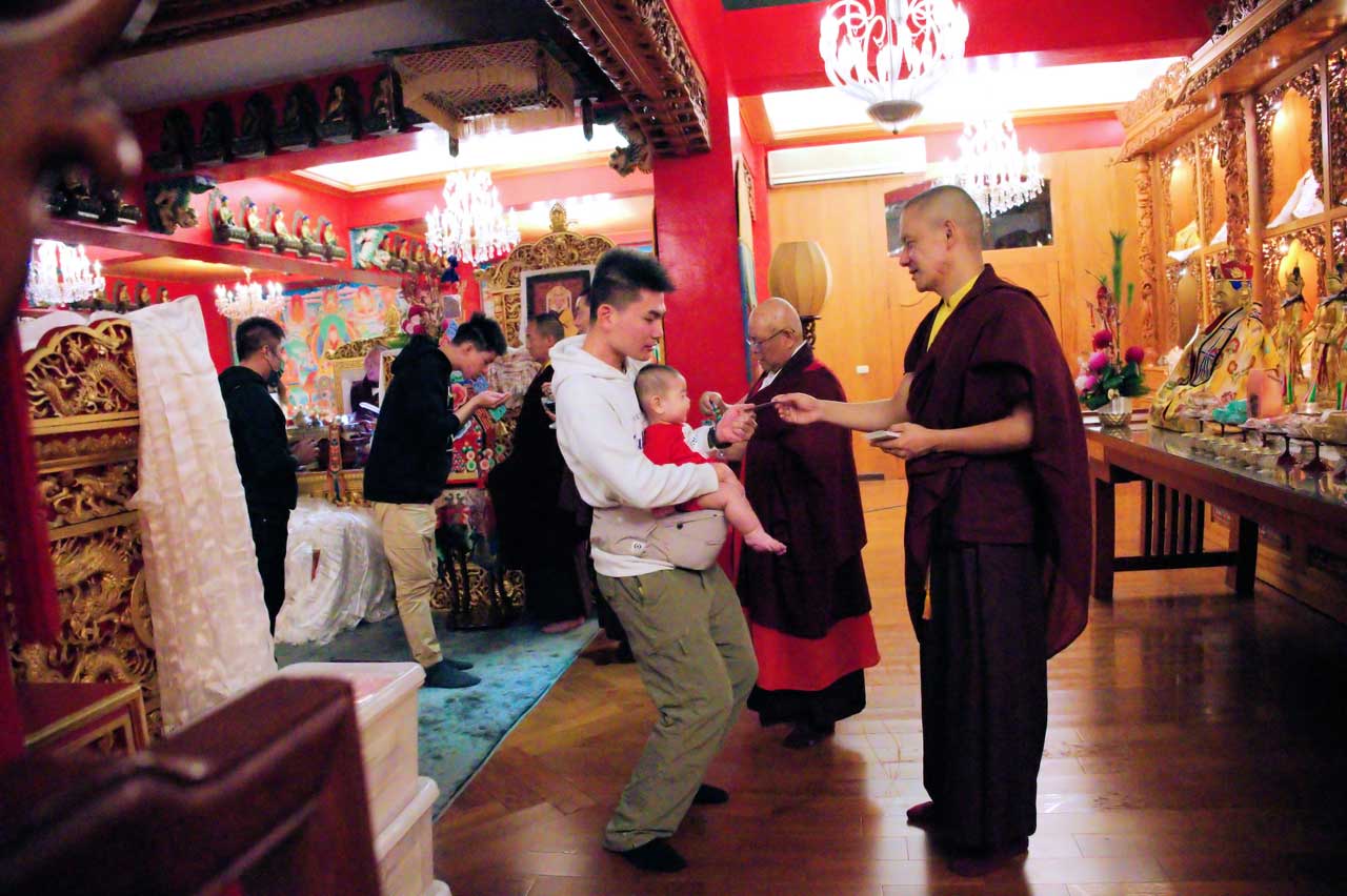 掌堂執事帶著志工群到舍利塔點燈、唱誦點燈祈願文、敲鐘,接著到各殿院向諸佛菩薩、本尊空行、噶居歷代祖師、十大傳承上師、護法聖眾頂禮,敬獻湯圓。這可是一年一次的機會,要好好把握哦!