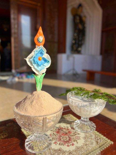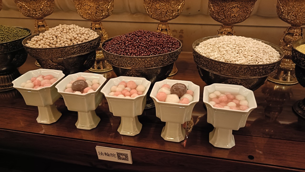 今年供湯圓用的是「雨過天青色」的高足碗,淺淺的碧綠色托著飽滿的湯圓,方形的碗面圍著圓溜溜的湯圓。志工師兄們小心翼翼地捧在手心,高舉過眉,祈求諸佛菩薩、本尊空行、噶居歷代祖師、十大傳承上師、護法聖眾納受,而後齊聚到文殊院迴向、祈願。隨著獻供的進行,時間之輪也悄悄的從2024跨入2025了。