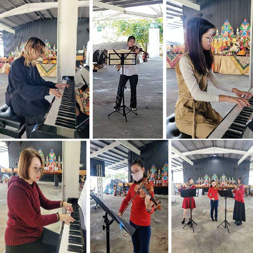 有位師兄帶三位千金來演奏音樂時,正是人潮熱絡的時候。選飾品的、翻結緣書的、品咖啡的、剝水果的、吃糕餅的、喝紅茶的、端紅豆湯的、排隊點車輪餅的、坐石椅曬太陽的、推著小嬰孩的、拉著寵物犬的,在悠揚的琴音中,眾人各自陶醉。到了初四還有音樂老師志工帶著學生來寺演奏,美妙的樂音讓眾人如癡如醉。