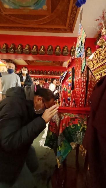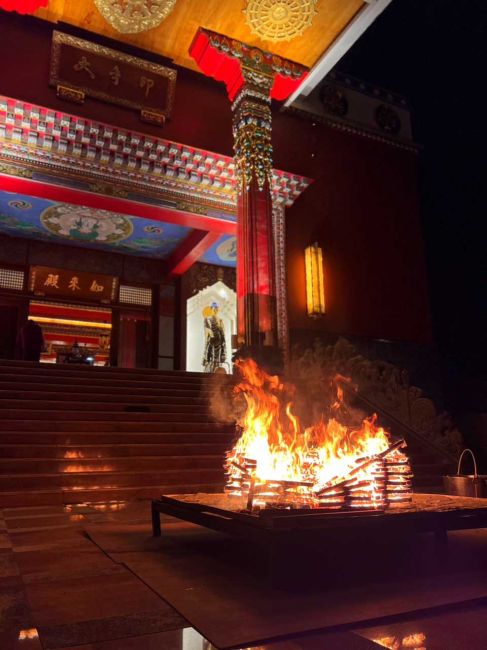 吃完年夜飯後最後一場靈噶火供, 上師仁波切親自主法。火供的功德利益在於能成就「息、增、懷、誅」四大事業,帶走業障病魔,纏身餓鬼外靈,令生淨土,因此小至個人,大至國家,皆能息災增運。