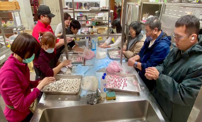 除夕夜的火供之後,留寺的志工師兄們移往廚房,動手搓湯圓。笑語聲中,一顆顆圓潤的紅湯圓、白湯圓在鍋裡上下起伏、雀躍不已。