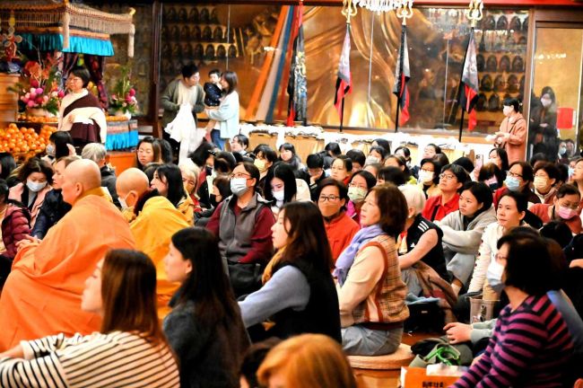 人群如潮水般湧入如來殿,誠心與期盼交織成一片,整個殿堂彷彿被溫暖的光輝所籠罩。即使如來殿三樓的空間已經擠得滿滿,還是有信眾在樓梯間耐心等待,心中充滿了對佛法無限的敬仰與渴望,每一分等待都是對諸佛菩薩慈悲心懷的深深致敬。