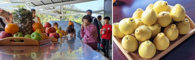志工們把水果、糕餅裝盤擺滿,每桌都有。遊客得知都是可以自由取用時,許多人的第一反應是驚喜,「哇,怎麽那麼好!」不少遊客問:「這是什麼水果?」「這是肚臍柑,不會很甜,也不會酸,吃了很舒服,氣味很芳香哦。」「這個吃了很好,以前看都沒看過,不知道有這種水果,是你們種的嗎?」志工一聽笑起來,「不是我們種的。這是供佛的水果,可以帶回去跟家人分享哦。」