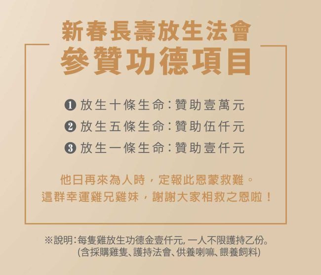 敬請踴躍布施,護持新春長壽放生法會。慈悲所在,諸事吉祥!一念為真,成就菩提。