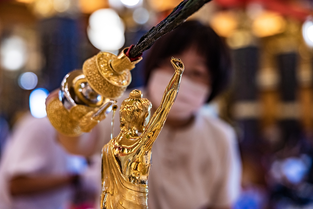第八天莊嚴隆重浴佛,清淨眾生五濁煩惱。眾人如天神般,高舉寶瓶以甘露水沐浴金佛。黃金佛陀初生像,四方各有七朵金蓮花,稀有殊勝,祈願見聞憶觸者均獲無量福德,求飲浴佛金湯甘露,消無量業。盛大素宴供養佛陀與十三地菩薩。輔以雅樂妙音,典麗香華薰爐嚴飾,祈願佛佑台灣國運昌隆、永寧長安!