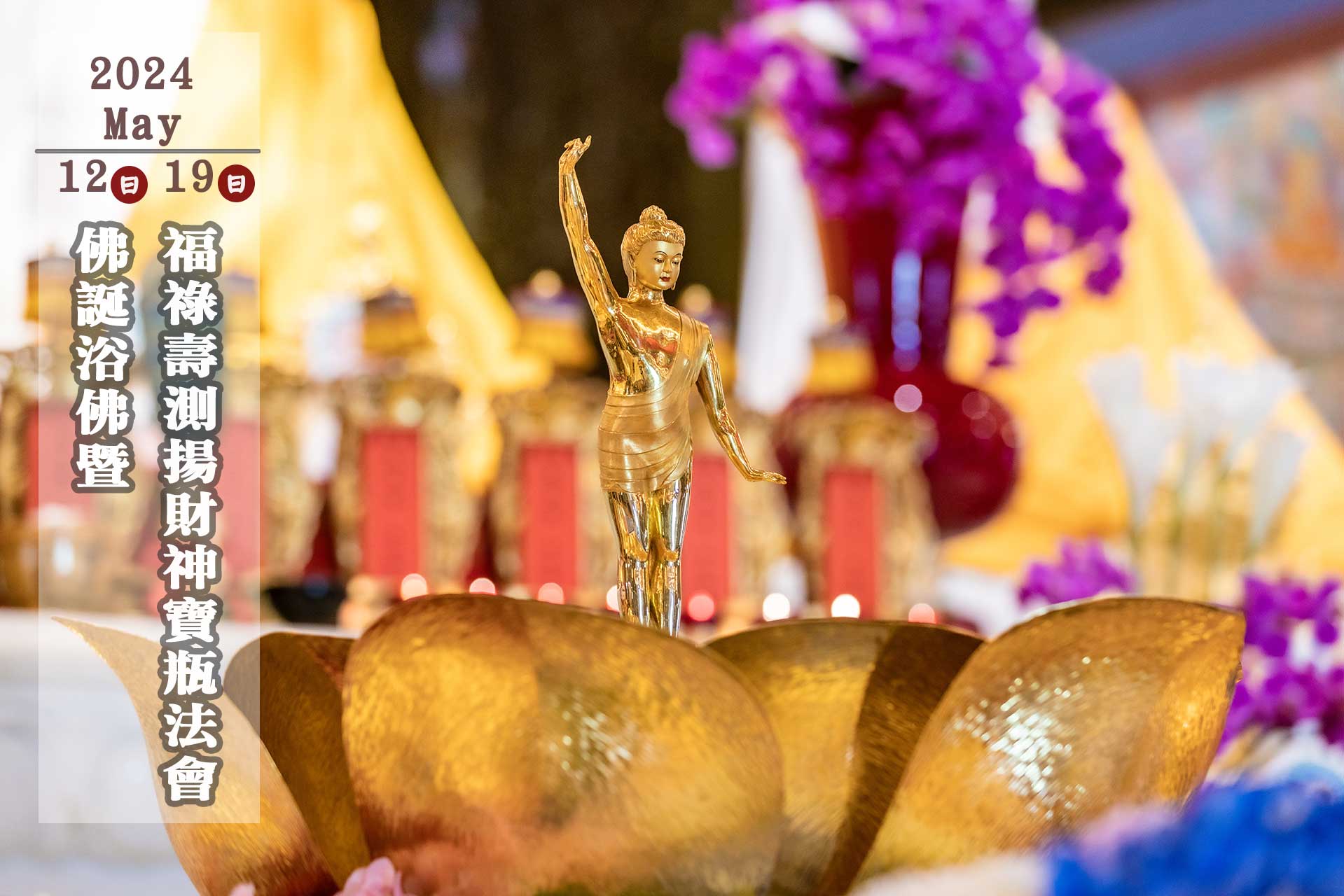 慶祝佛誕,浴佛與福祿壽測揚財神寶瓶法會合併舉行,前七日盛大舉行福祿壽測揚財神寶瓶法會,加持弟子善信健康延壽,增長福德智慧。祈願疫情陰霾散盡,世界繁榮吉祥。