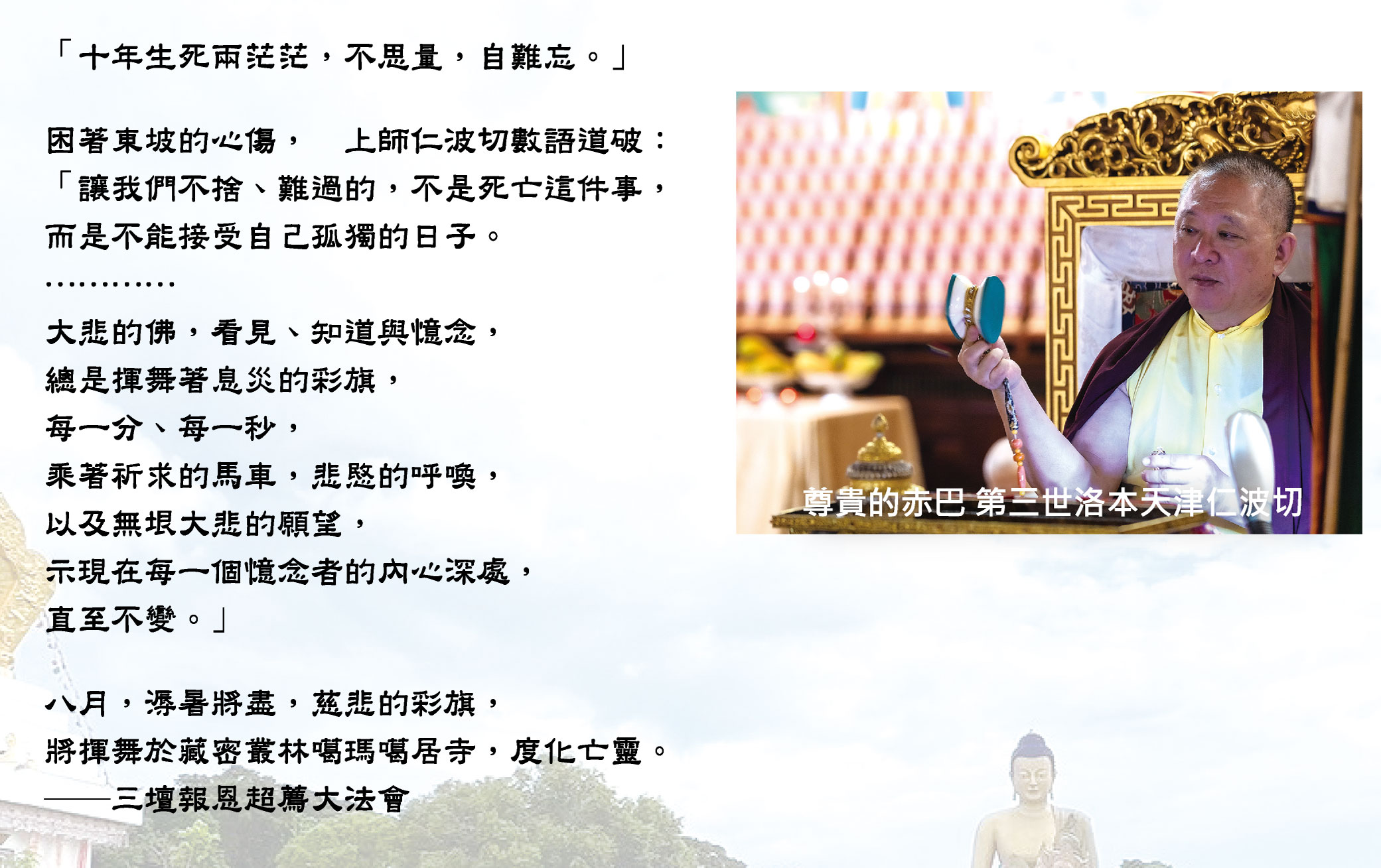 噶瑪寺「三壇報恩超薦法會」,為十方信眾啟修殊勝密法;將縈繞在您我心頭的思念,巧妙化為無限無盡的祝福!