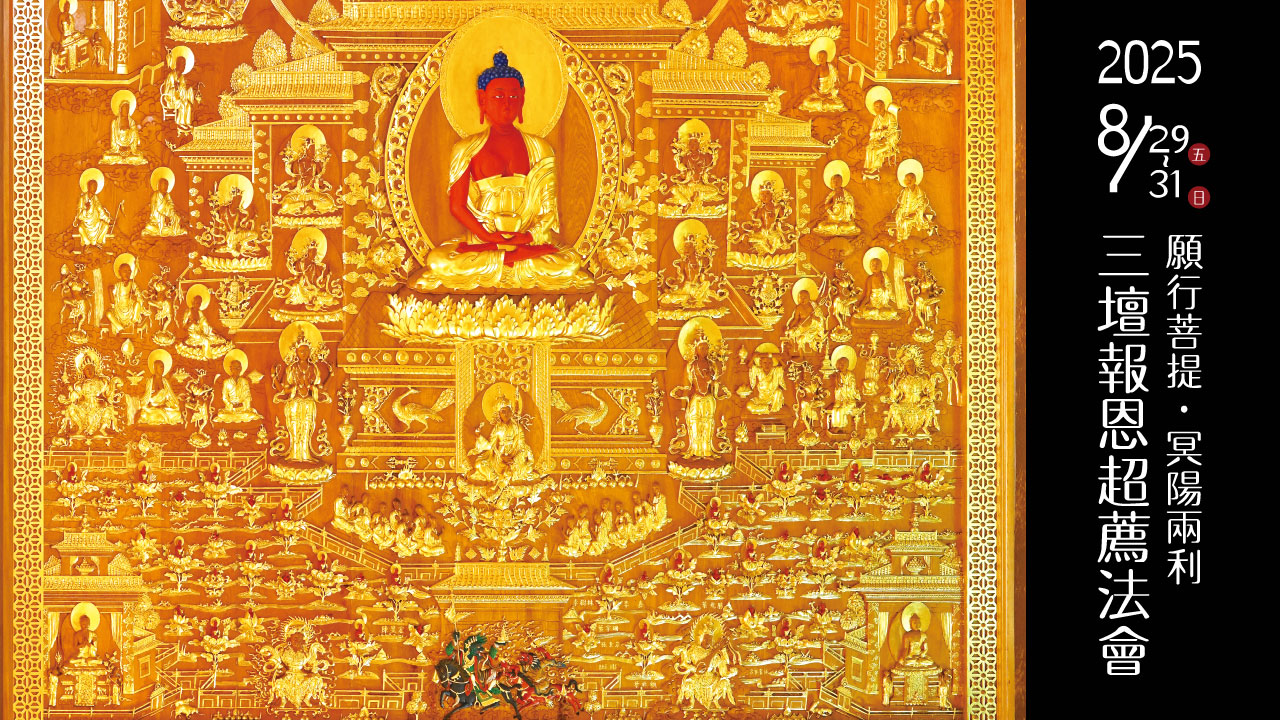 本寺謹訂於中華民國114年8月29日(五)至8月31日(日),舉行「三壇報恩超薦法會」,恭請尊貴的 洛本天津仁波切主法,啟建阿彌陀佛密壇,超薦先人、累世父母、十方欲度幽靈及因天災人禍疫病往生之眾生等,悉令出離輪迴苦海、往生極樂世界,誠請法友匯聚善念,合力持誦阿彌陀佛真言,功德迴向世界。祈願疫情、天災、戰爭儘速平息,兩岸和平,眾生離苦得樂。