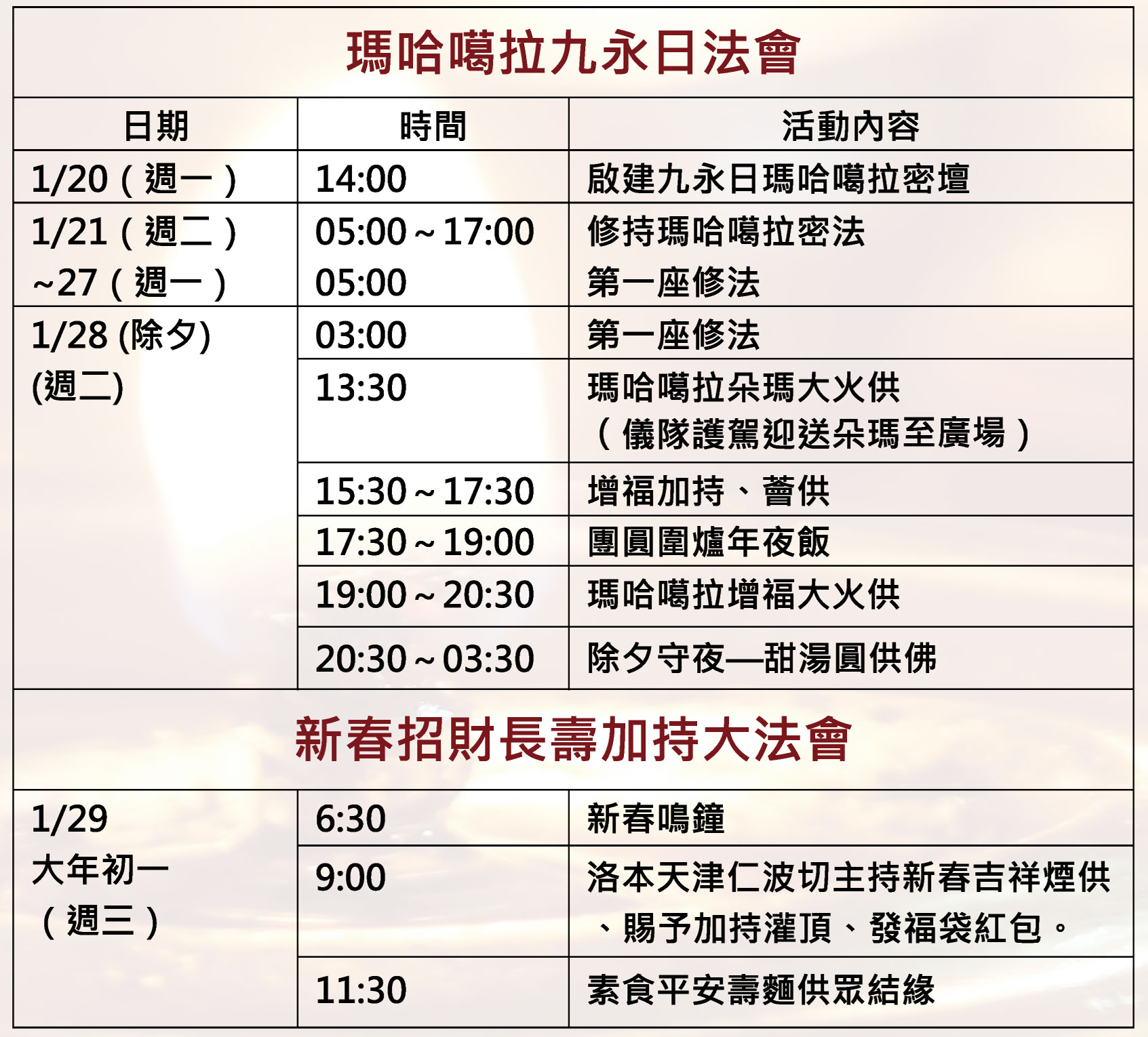 1/28除夕下午火供,以及1/29上午九點領受 仁波切加持,歡迎十方善信大德踴躍參加,同霑法喜,新春吉祥!